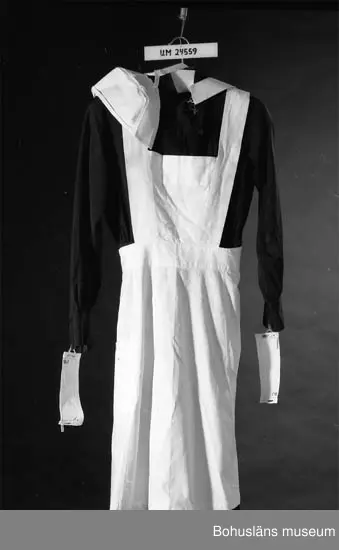 1. Svart klänning. L:107 B:79 ÄL:49 cm. Öppen ner till midjan framtill. Stängs med fyra