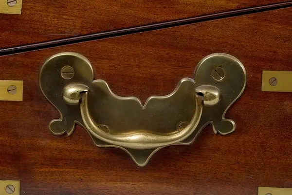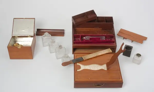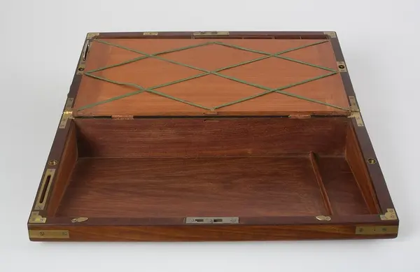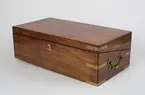 • Skrivschatull av mahogny med mässingsbeslag. Lock och underrede bildar i tillbakafällt läge ett sluttande skrivvänligt plan. Tillhörande exklusiv inredning med tillpassad och ytterst kompakt förvarin... Visa hela