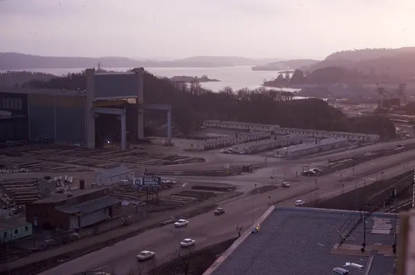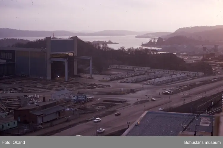 Fotoserien märkt med Huvudkontor 2. Byggnationen av varvets nya huvudkontor, "Blåkulla". Det används idag som stadshus. Fotot taget från taket. Nedanför syns gamla E6:ans sträckning, sektionssammansättningsverkstaden och kontorsbarackerna som bl. a. inhyste ritkontor.