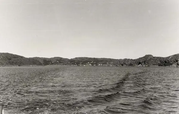 "Utsikt mot Nösund från farleden mellan Lyrön (till h.) och Mollösundslandet (till v.).