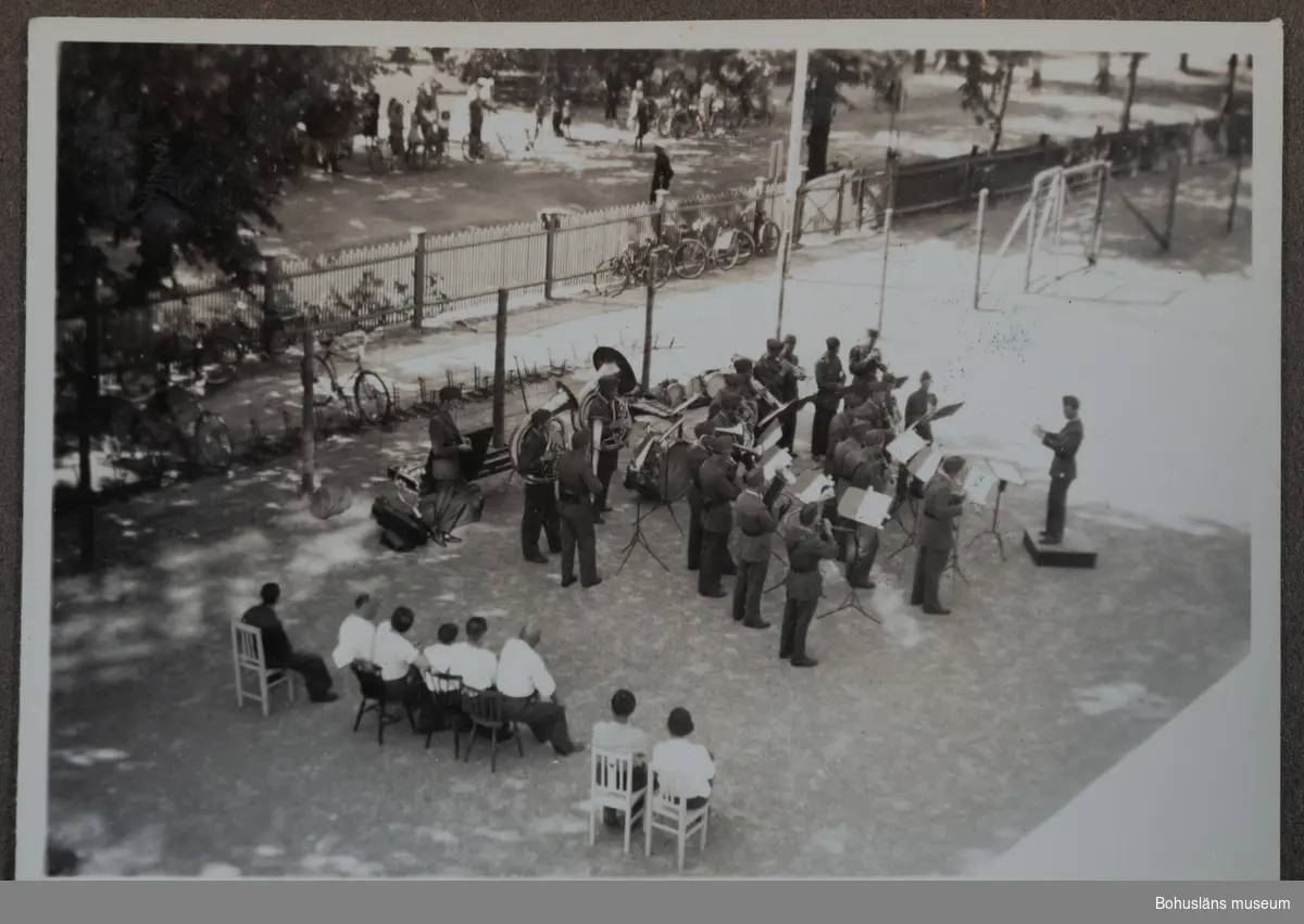 Givarens mamma Margareta Carlsson (1908 1964) arbetade på beredskapssjukhuset som biträde. Givaren har antecknat i anslutning till den borderade duken: Namn på koncentrationslägerfångar som kom till Uddevalla sommaren 1945. Min mamma arbetade som biträde på beredskapssjukhuset som var beläget i Margretegärdeskolan. Dom kom troligen med dom Vita bussarna. [Skall vara Vita båtarna.] Flera av de personer vars namn finns på den broderade duken och som har skrivit i anteckningsboken är med största sannolikhet avbildade på fotografierna i albumet.