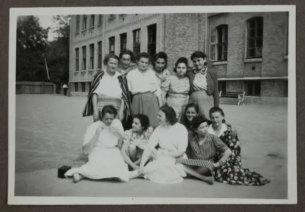 Överlevare från koncentrationsläger i Tyskland och sjukvårdspersonal samlade utanför Beredskapssjukhuset på Margretegärdeskolan.