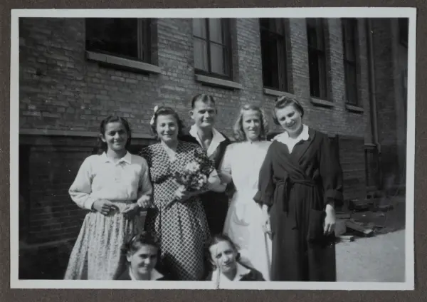 Överlevare från koncentrationsläger i Tyskland och sjukvårdspersonal samlade utanför Beredskapssjukhuset på Margretegärdeskolan.