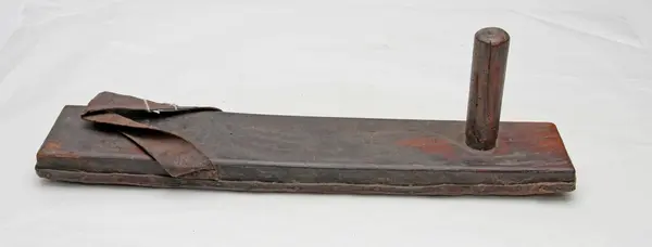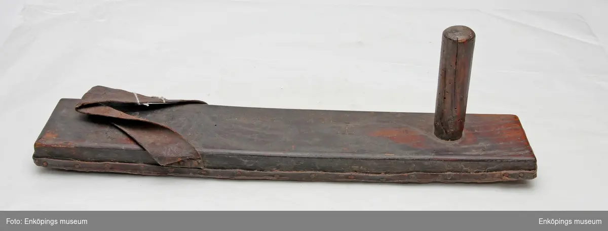 • Krusbräda av trä med en läderrem fastspikad på ena änden och med ett handtag på den andra änden. Räfflad på undersidan, lädret längs kanterna är fastspikat.