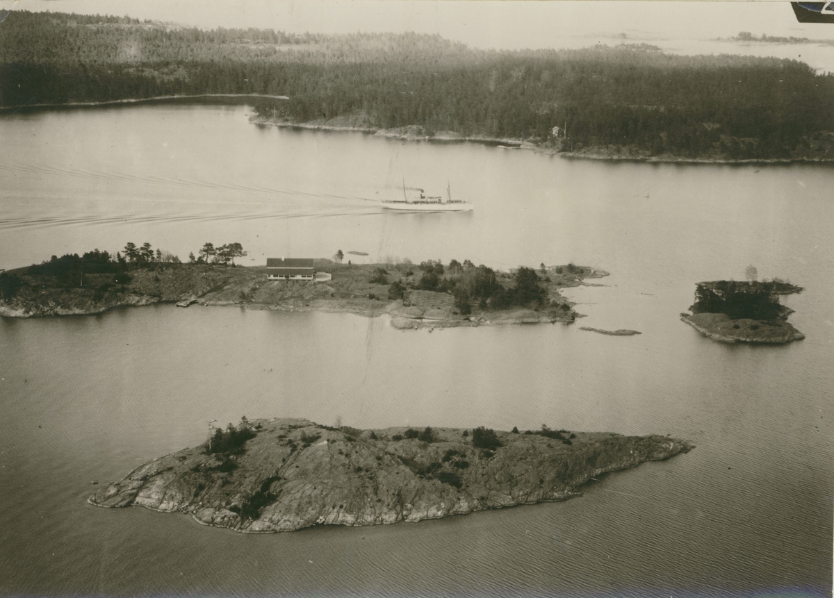 Flygfoto över ön Skansholmen vid farleden in till Västervik. Huset på ön är klubbhus för WSS (Westerviks SegelSällskap). Klubbhuset byggdes 1916 efter ritningar av arkitekt Axel J Sjögren.