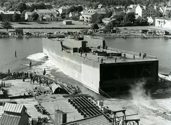Sjösättning. Ett av de sista och största fartygen som byggdes på Kalmar varv. Akterdelen byggdes i Kalmar, den främre halvan byggdes av Marstrands varv, och bogserades till Kalmar och de svetsades ihop på Kalmar Varv.