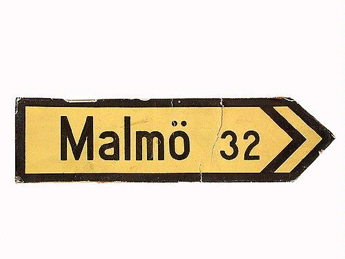 Trafikmärke, upplysningsmärke, bestående av en pappskiva formad som en avlång fyrkantig liggande skylt vars ena kortsida har dragits ut i en spets. På pappkivan är ett papper påklistrat. Papperet är gult och försett med en svart bård (B 0,2 cm). Bården är dubblerad i spetsen. Mitt i det gula fältet svart text: "Malmö 32" (vägvisare för huvudled)