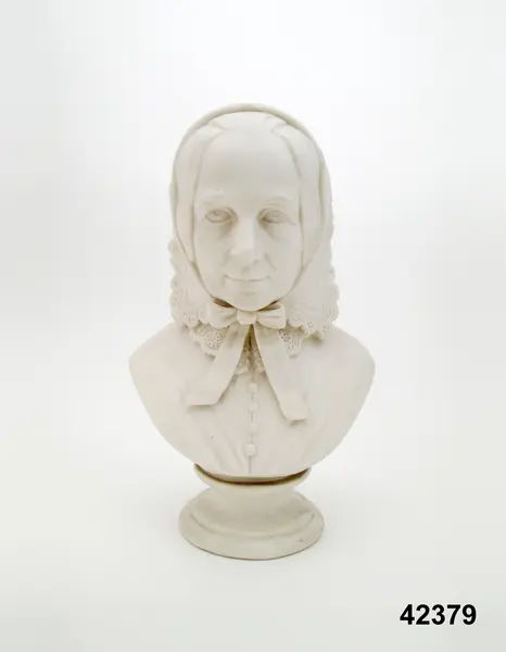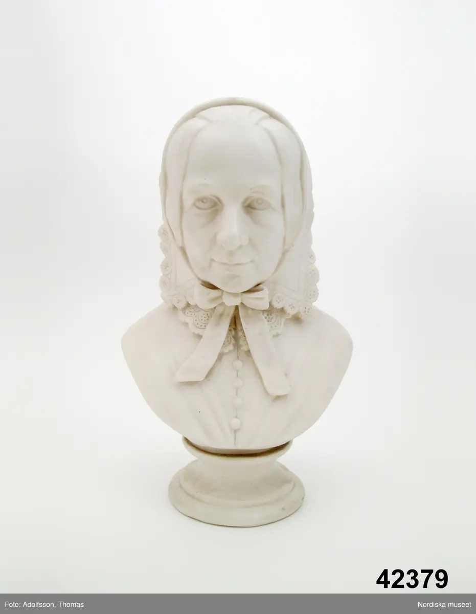 Porträttbyst med fot, av parian. Bröstbild av kvinna med spetskantad scharlett och enkelknäppt överdel med spetskarage. Bysten föreställer Fredrika Bremer (1801-1865) författare och kvinnorättskämpe. Bysten modellerad 1871 av Anna Retzius, f. Hierta, förkämpe för kvinnans rättigheter, och tillverkad av Gustafsbergs porslinsfabrik.