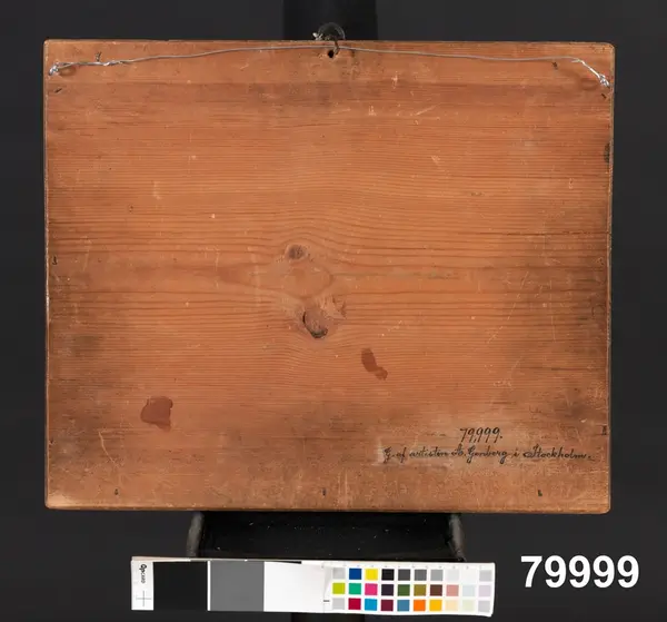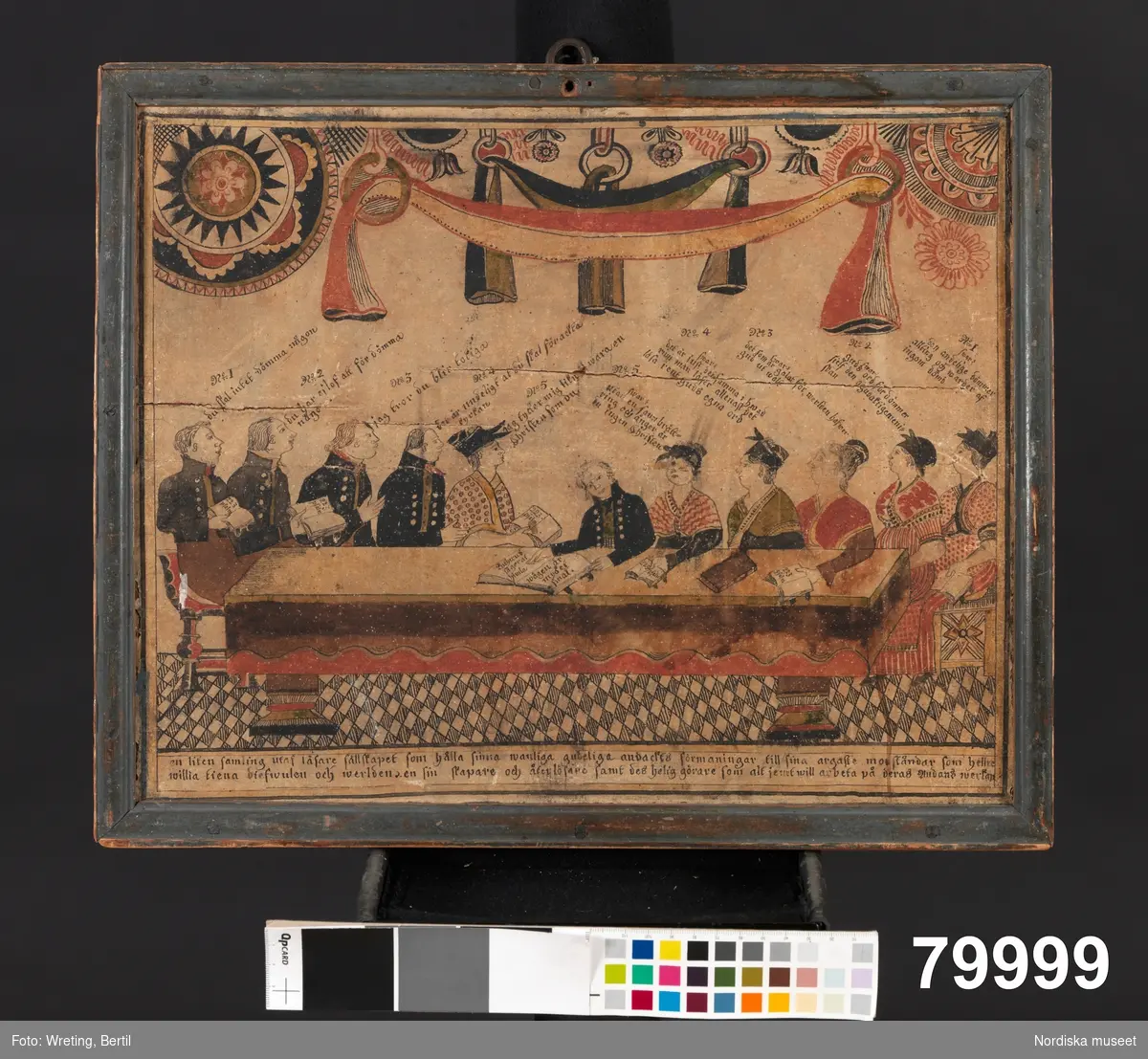 "Allmogemålning. 'En liten samling utaf läsare sällskapet som håller sina wanliga gudliga andackts förmaningar till sina argaste motståndare' etc. Spräckt. Uppklistrad på trä och omgifven af en smal, blåmålad träram. G. af artisten A.Genberg i Stockholm 28/2 1895."