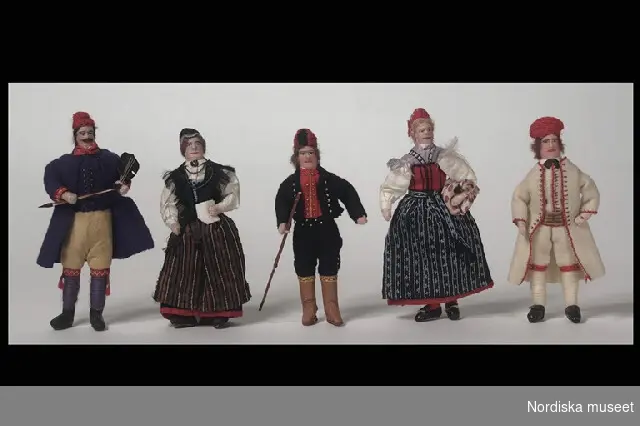 • En samling dockor, 50 st samt två äreportar. Dockorna är klädda i svenska folkdräkter och bildar ett bröllopståg. Från 'De gamlas' dags dockutställning 1911. Tillverkade av givarinnan.