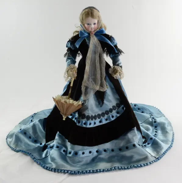 "Docka, porslin, chignon med rosor i håret, klänning av grått blommigt siden, framvåd pärlbeströdd tyll, garnering av siden, lilafärgat; med gula skinnhandskar; lorgnett; från Paris, 1870, anv. som skyltdocka i fönstret. Gåva 20/11 1933 av fröken Dagmar Landelius, Stockholm."