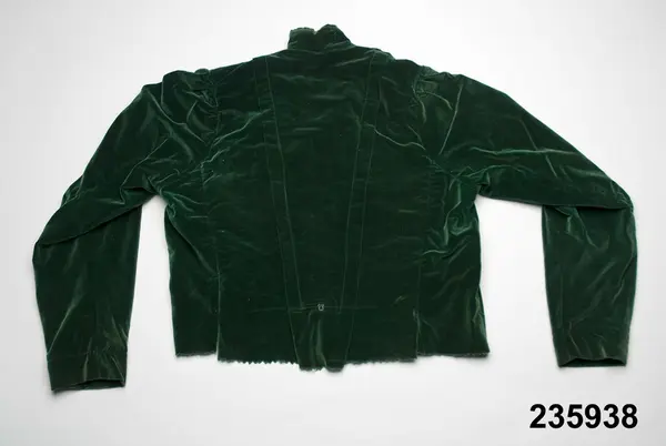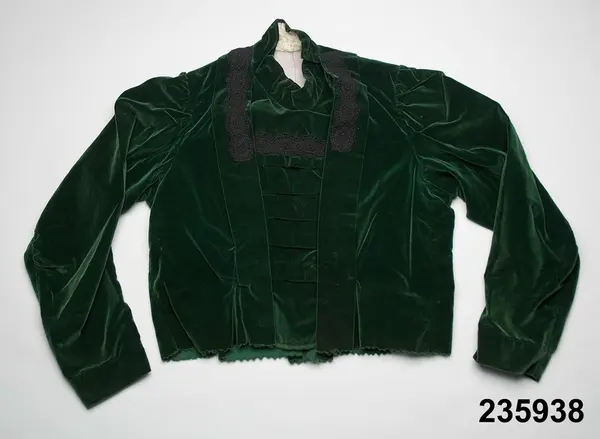 • Liv till en 2-delad klänning eller möjligen bara en blus som burits till annan kjol. Av mörkgrön bomullssammet i modesnitt från omkr. 1900 men utan de insydda stålfjädrar som då var vanliga. Sydd på foderstomme av grå bomullslärft. 2 framstycken med ett djupt längsgående veck på var sida om en tvärveckad fastsittande isättning. På vecken samt tvärs över isättningen applikation av svart maskingjor... Visa hela