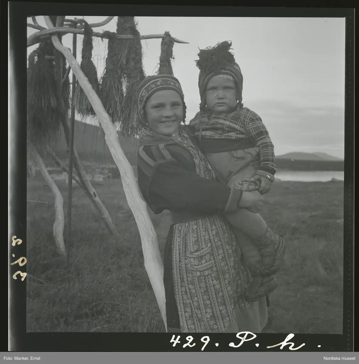 - En flicka bär ett litet barn i famnen. De står intill en torkställning där det hänger flätor av gräs/ hö.