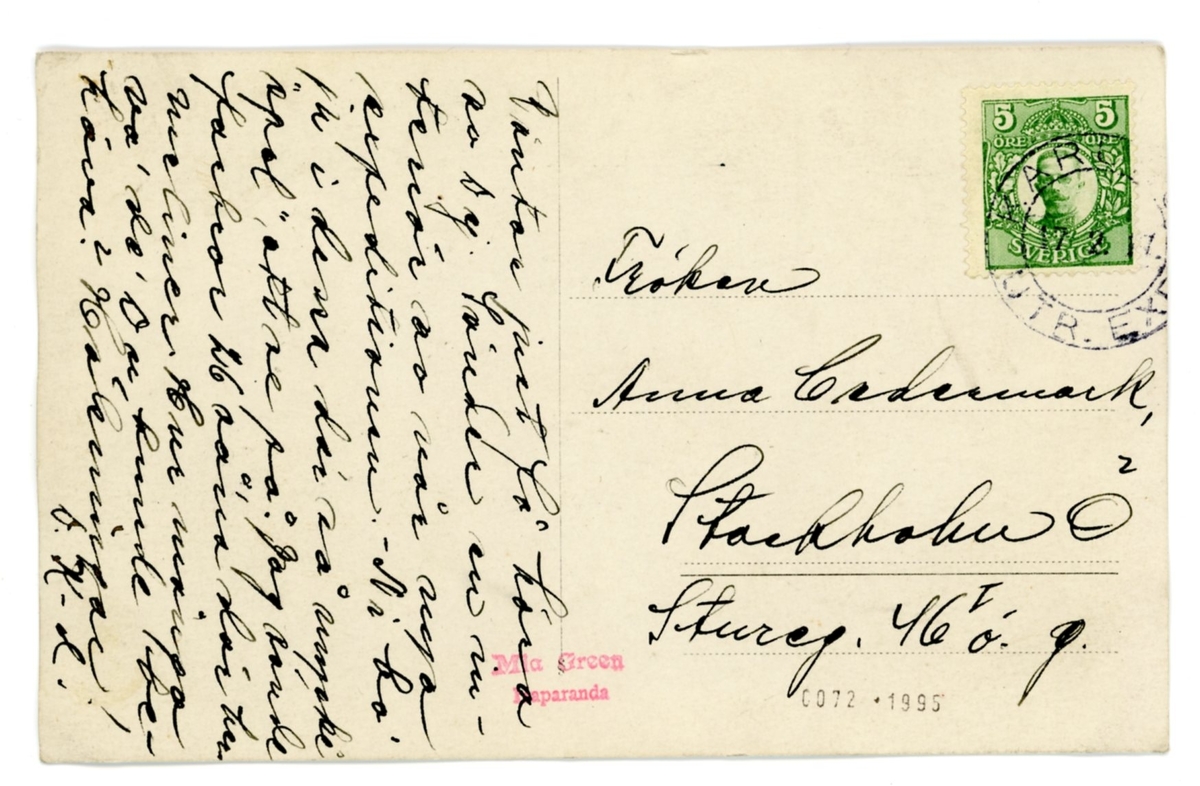 Vykort skickat från Konrad Jonnson till fröken Anna Cedermark, Stockholm.