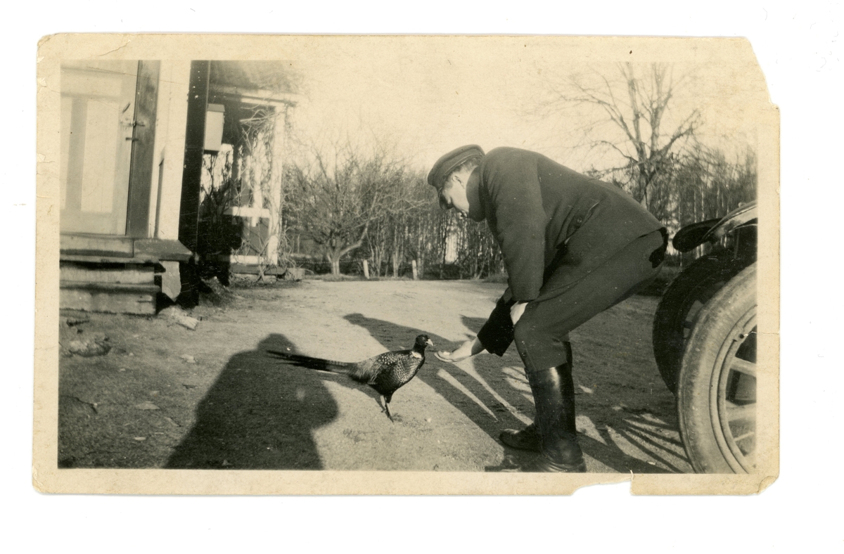 Lantbrevbärare Axel Bengtsson matar en fasan.