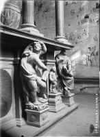PORTALER Kyrkans västportal uppfördes år 1648. Portalen har en arkitektonisk uppbyggnad där den korgbågiga öppningen omramas av två fristående kolonner på vardera sidan. Kolonnerna står på postament och bär kraftiga konsoler. På konsolerna vilar ett bjälklag, vilket är förkroppat över konsolerna. Över bjälklaget finns ett putsat parti som binder samman portalen med tornets höga västfönster. Portens dörrblad består av kraftiga, hopnitade järnplåtar, vilka på baksidan är stagade med korslagda järnband.