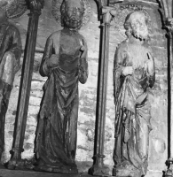 Delar av tornets västfasad och långhusets södra fasad består av fint huggna kalkstenskvadrar. Den senare fasaden har även oregelbundet inmurade kvadrar med huggen dekor (rundbågsfris och del av en drake).