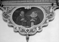 Gluggarna i korets östra gavelröste och i sockenmagasinets västra gavel har tjärade luckor av stående bräder.