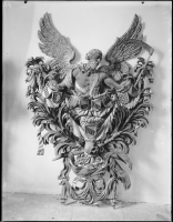 Fönsterna är rundbågiga försedda med järnsmideskarm och blyspröjsade glas.