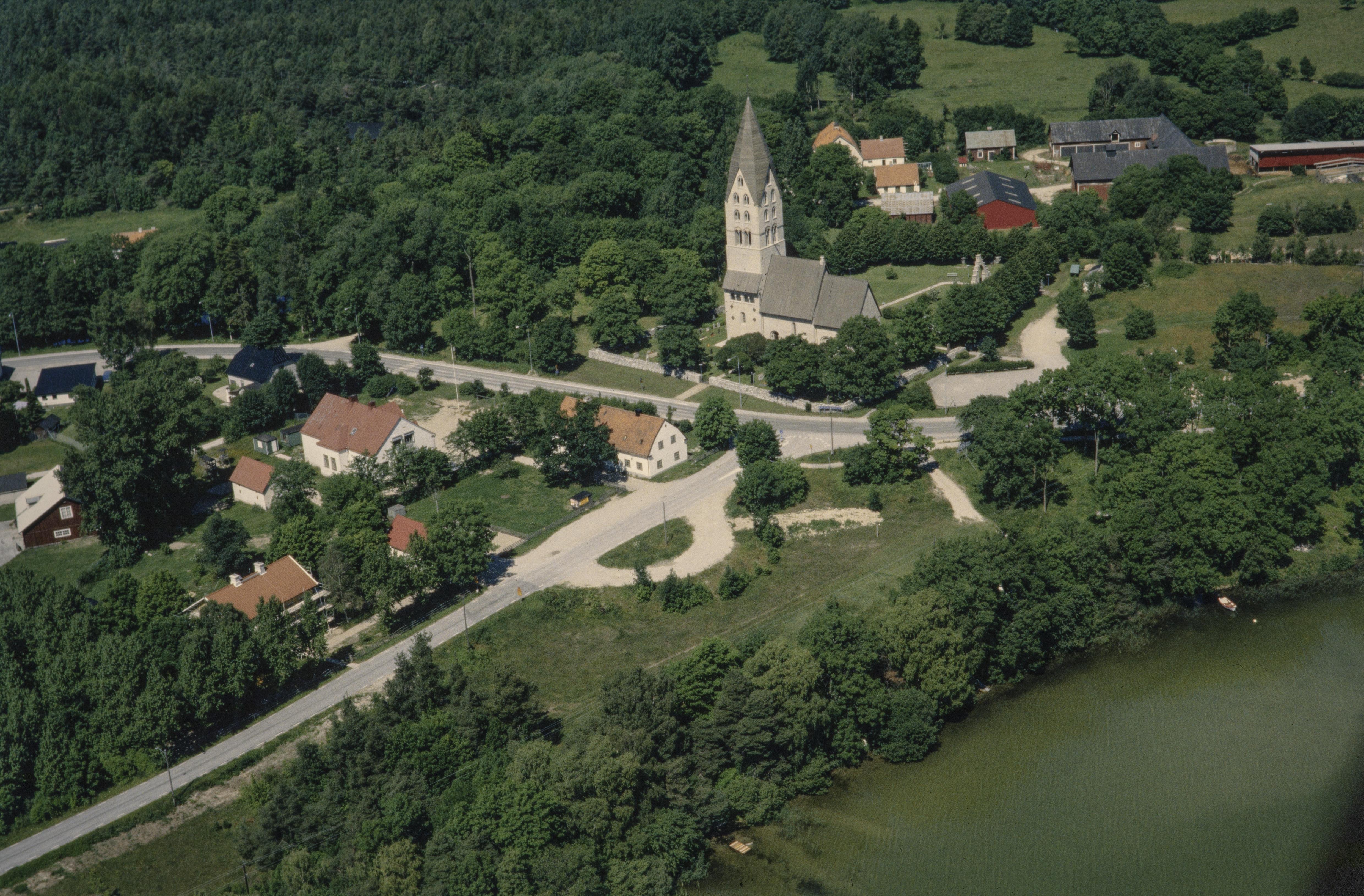 Tingstäde kyrkby. Tingstäde kyrka vid bildens mitt. Vid kyrkan husgrund RAÄnr Tingstäde 1:1. Sjön Tingstäde träsk nere till höger. Bilden är tagen mot (väderstreck): NNV Fotosyfte: Flygbildsdokumenta...