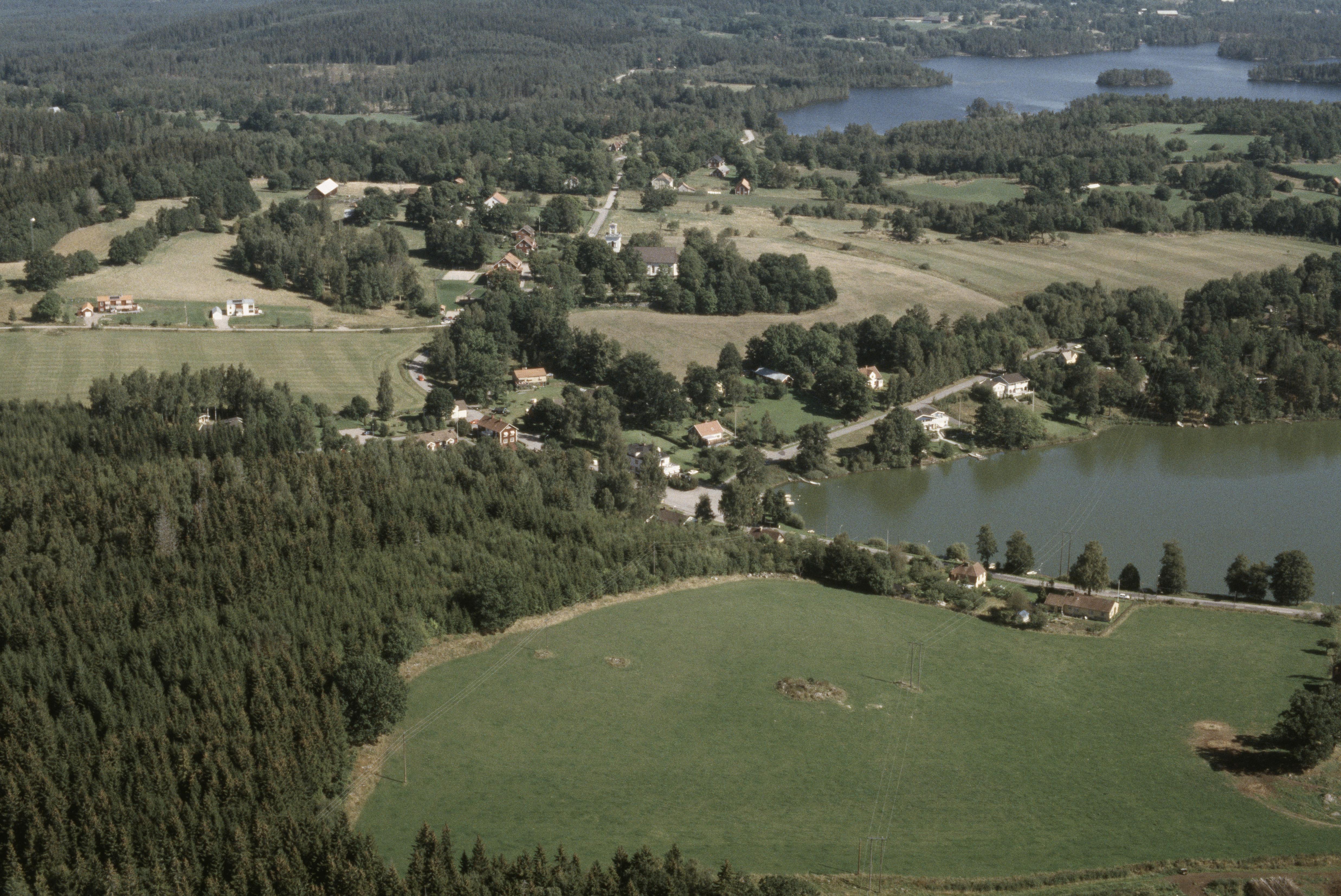 Skirö kyrka och kyrkby vid Skirösjön. I bildens nedre del kyrkoruin och begravningsplats RAÄnr Skirö 12:1 m.fl. Bilden är tagen mot (väderstreck): NO Fotosyfte: Flygbildsdokumentation