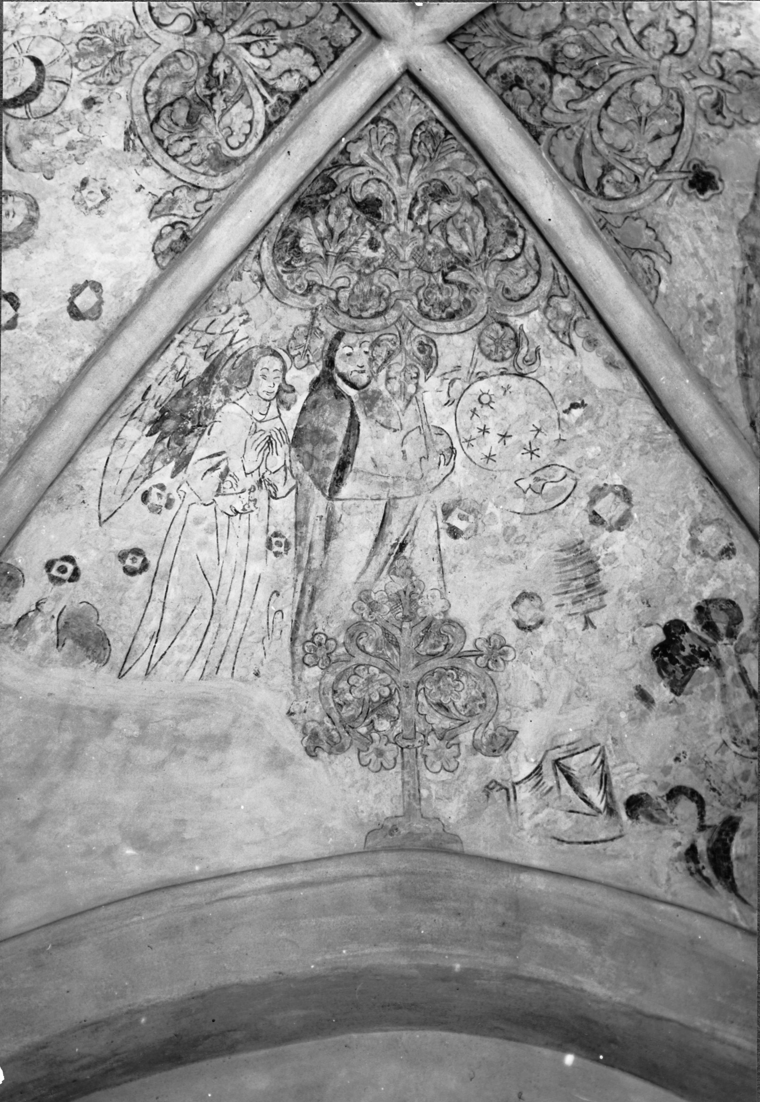 • Kalkmålningar i korvalvets norra kappa, efter restaureringen, föreställande himlakropparnas skapande 1400-talet. Ornamenten 1300-talet.