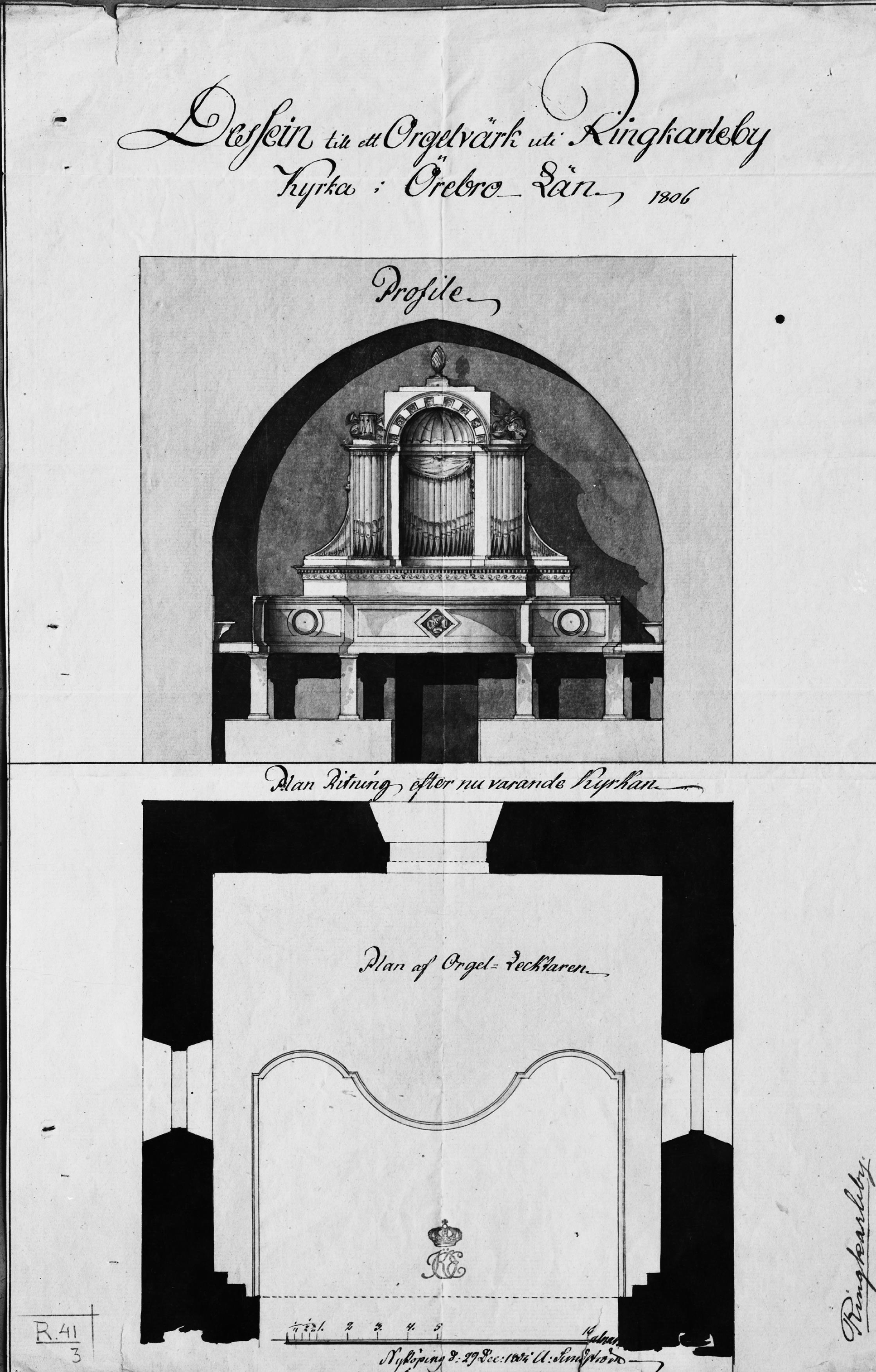• Foto av ritning av orgelfasad. Ur Kungliga Byggnadsstyrelsens arkiv