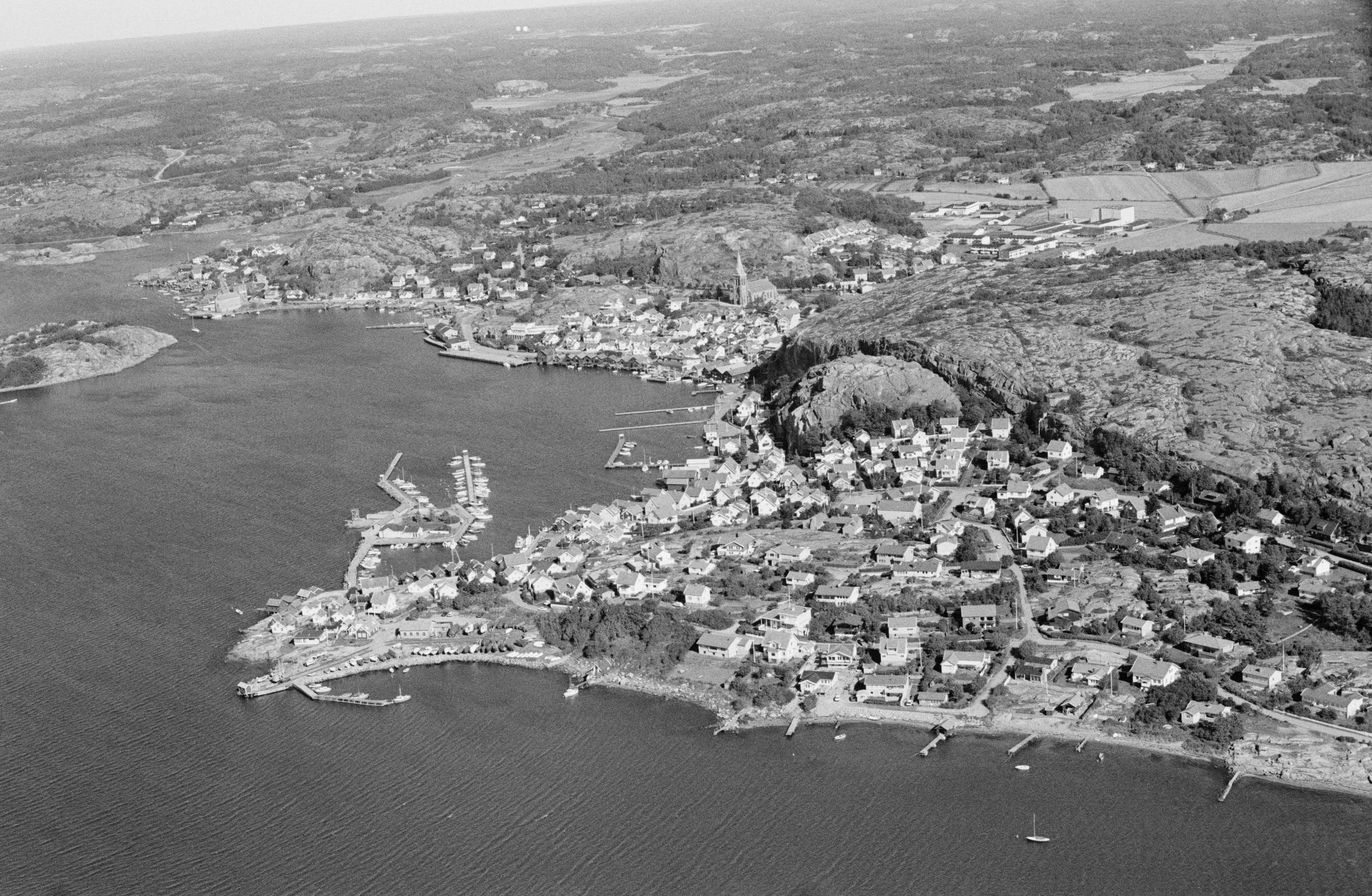 Fjällbacka tätort. Fjällbacka kyrka till höger om bildens mitt. Bilden är tagen mot (väderstreck): NNO Fotosyfte: Flygbildsdokumentation