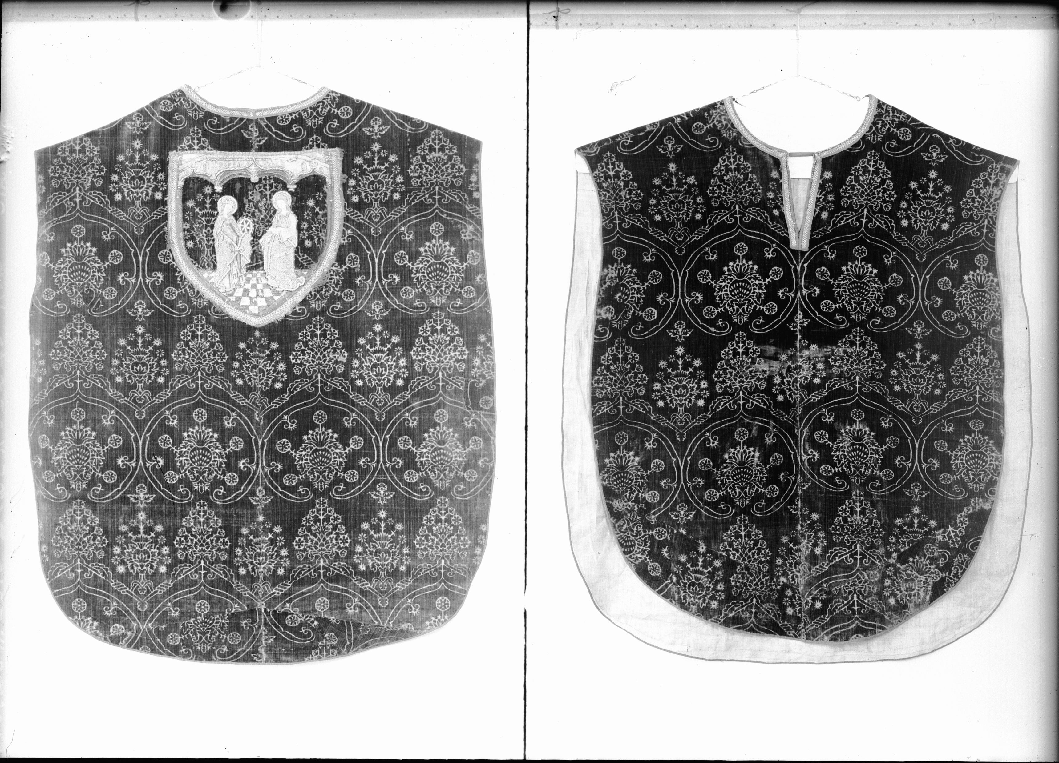 • Mässhake, fram och baksida. Före detta korkåpa? av grön granatäpplemönstrad sammet. Guld, silver och silkebroderier. Framsidan föreställer två kvinnliga helgon: Katarina av Alexandria och okänd. Från 1400-talet. Efter konserveringen.