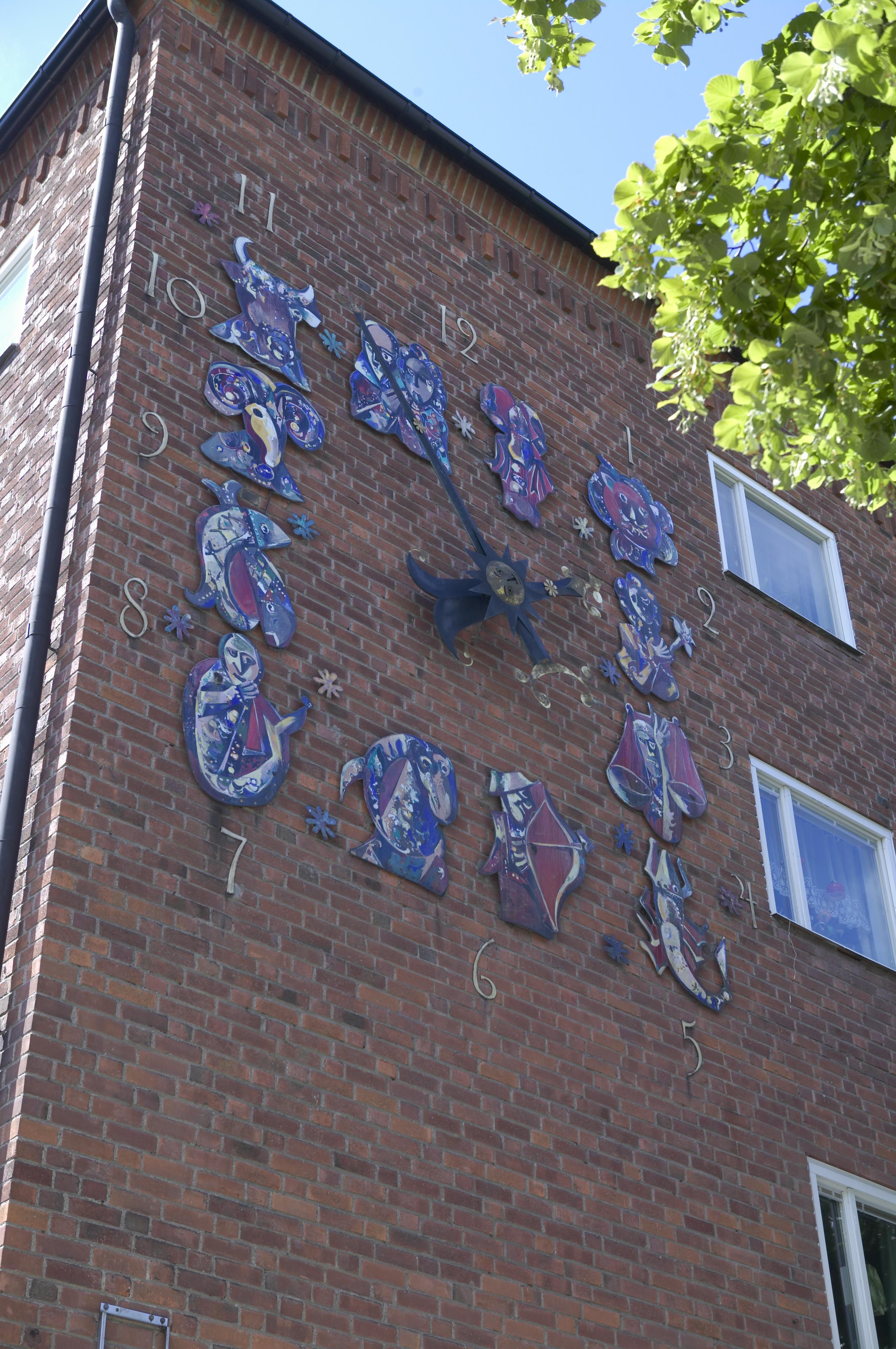 Västertorpsplan. Endre Nemes - "Klockan", en väggklocka med bilder av våra tolv stjärntecknen. Fotosyfte: Dokumentation