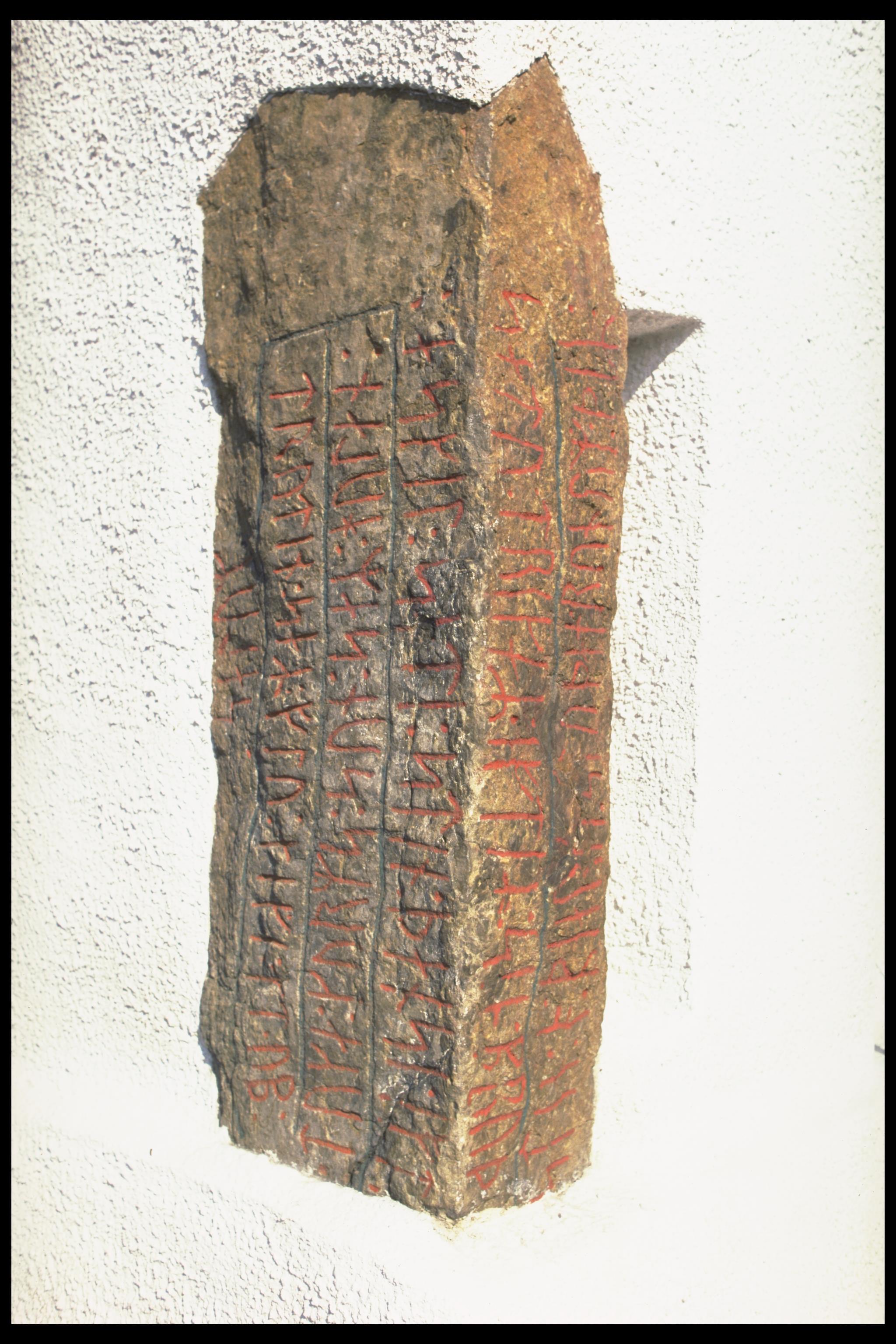 Runsten inmurad i Hällestad kyrkas östra vägg, RAÄ-nummer Hällestad 2:1. Inskriften lyder: Eskil satte denna sten efter Toke, Gorms son, sin hulde herre. Han flydde icke vid Uppsala. Kämpar reste efter sin broder stenen på berget; den står fast med runor. De gick närmast Gorms son Toke. Fotosyfte: Publicering