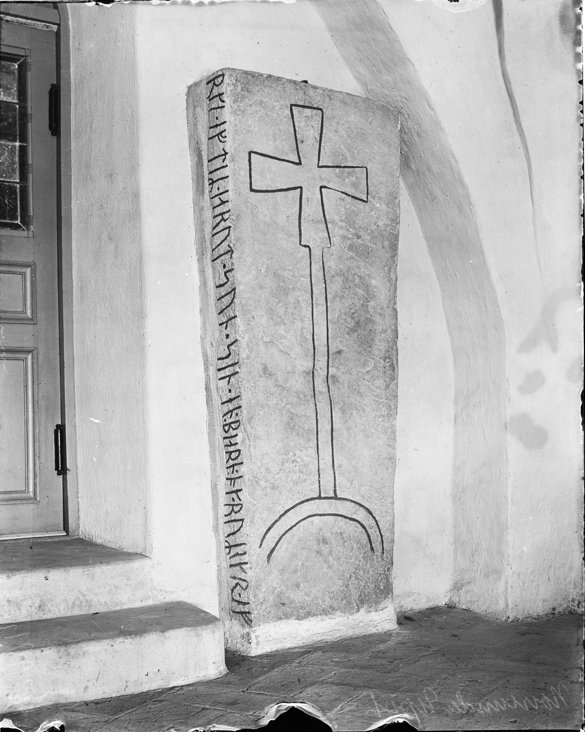 • Gravhäll med runskrift stående fastmurad i vapenhuset.