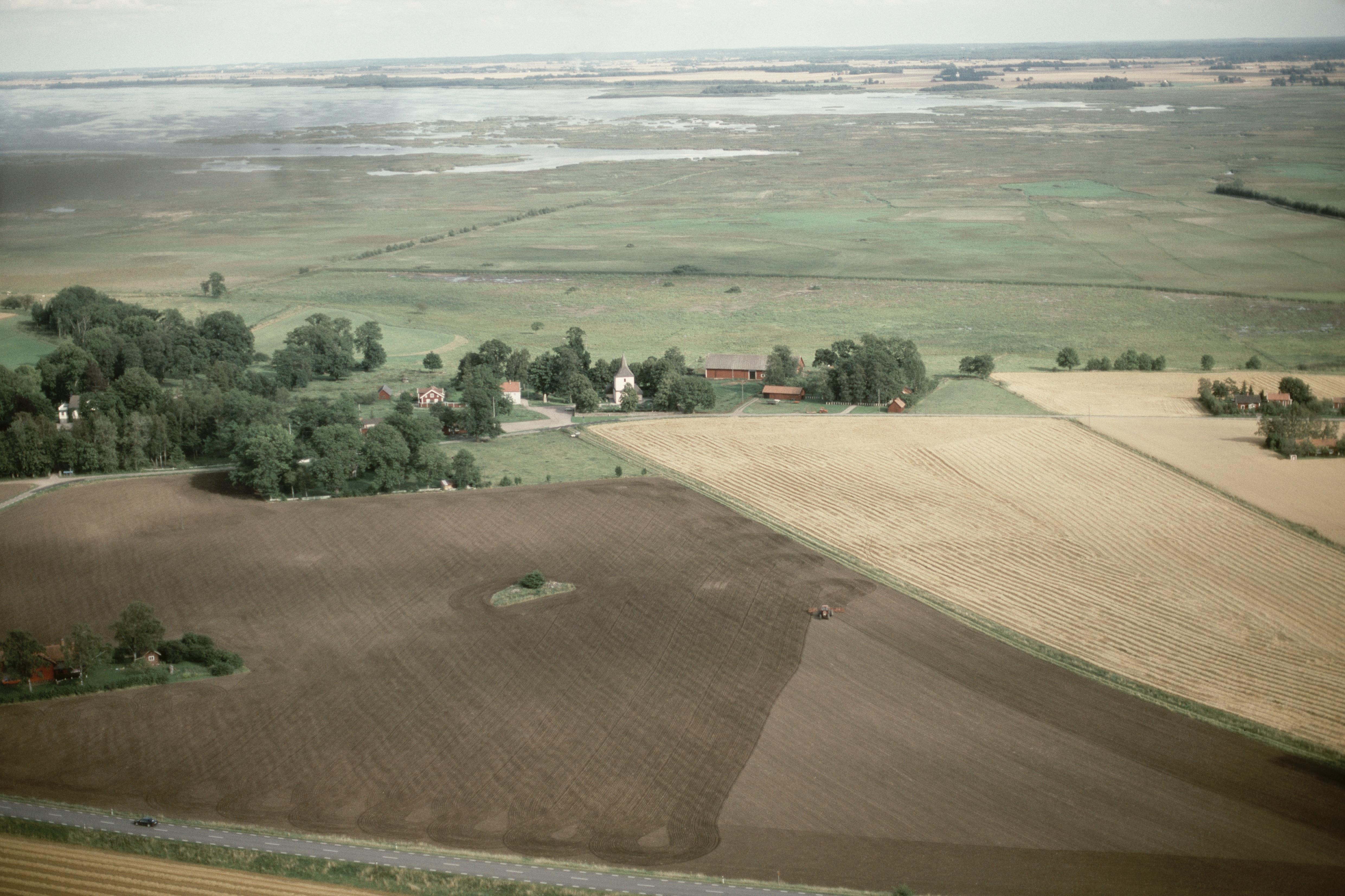 • Väversunda kyrka. Naturreservatet vid sjön Tåkern i bildens övre del. Bilden är tagen mot (väderstreck): SO