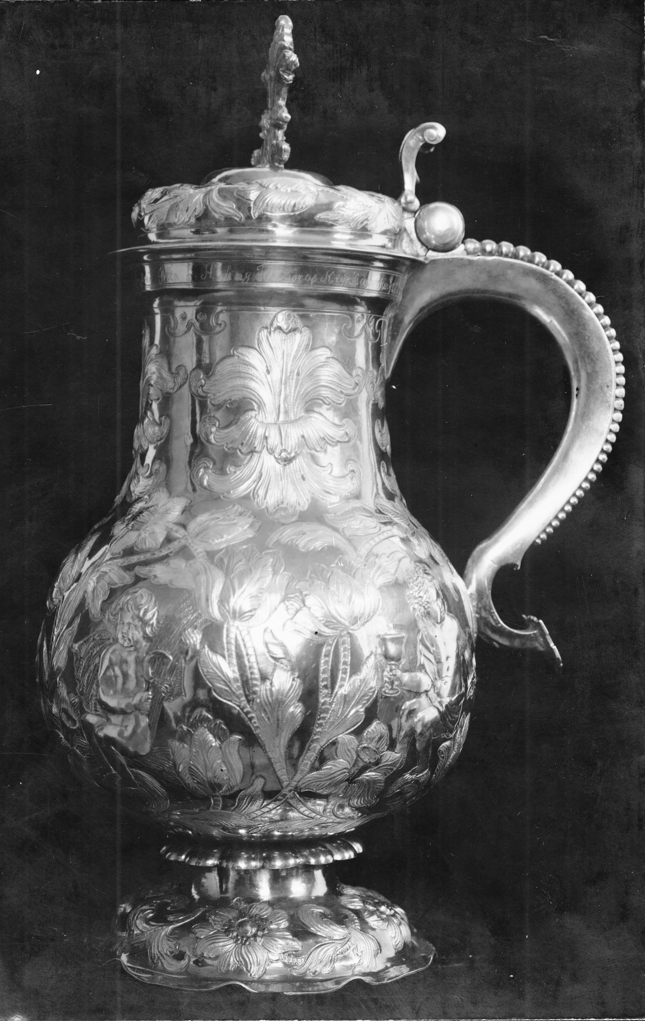 • Vinkanna, silver, förgylld invändigt, tillverkad i Augsburg omkring 1650.