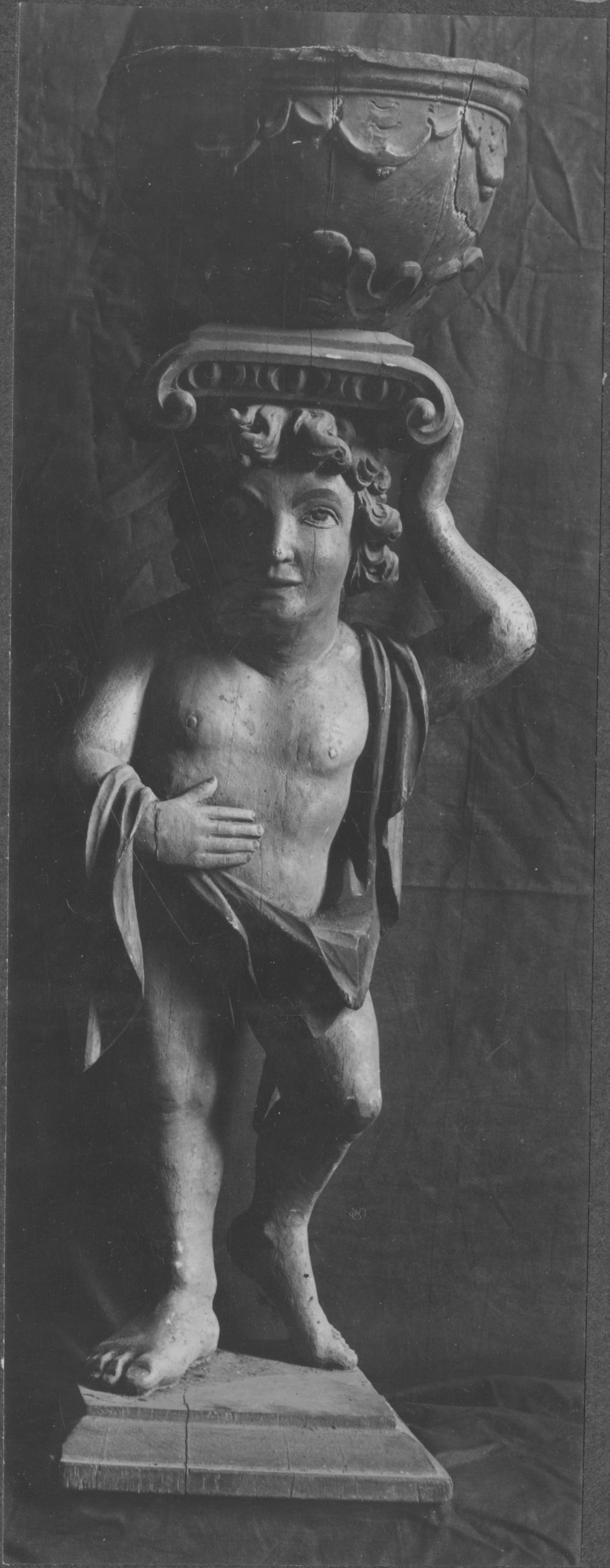 • Dopkärl uppburet av skulptur föreställande ung man.
