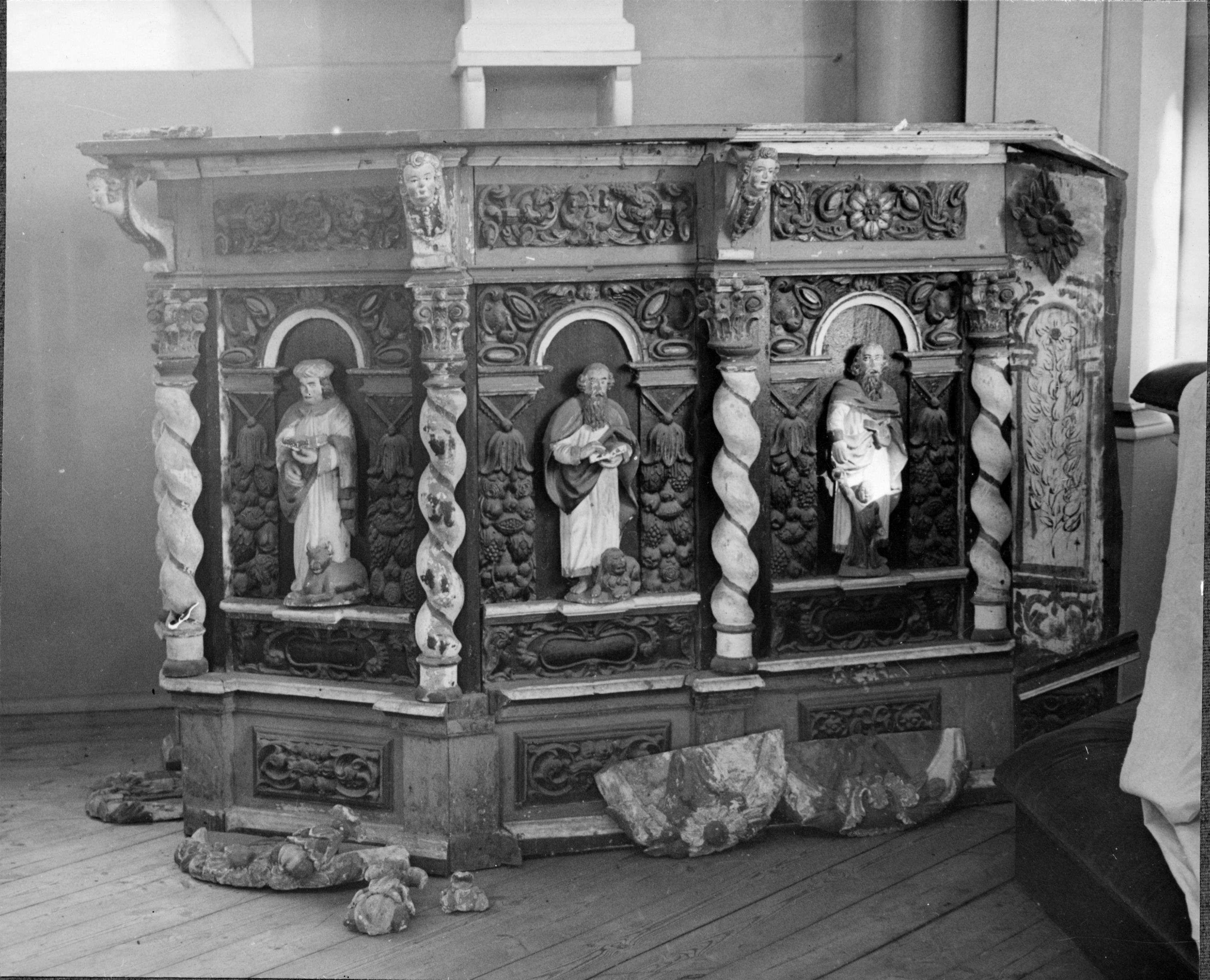 • Predikstol, detalj. Före restaureringen 1936.