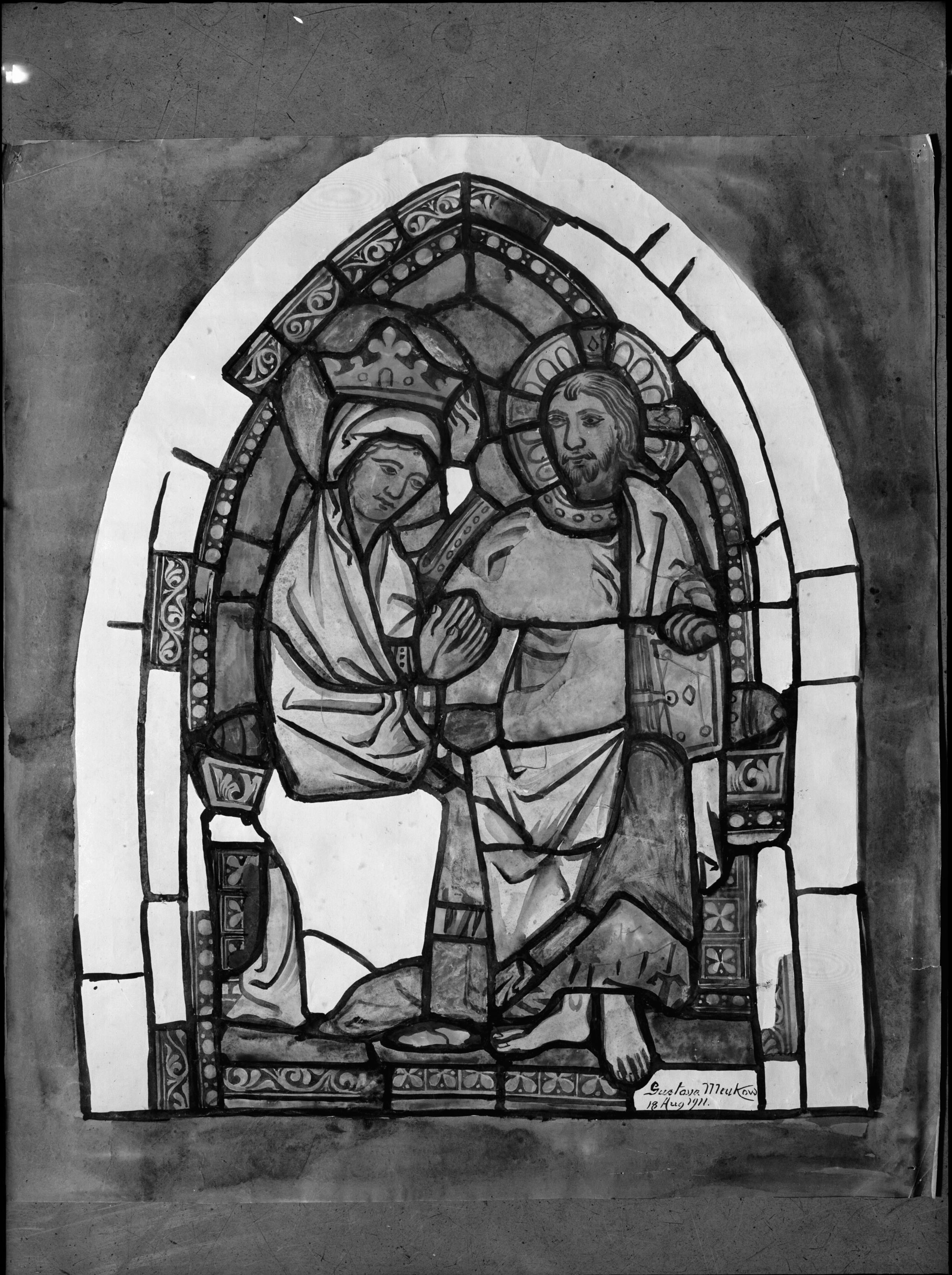 • Glasmålning. I korets och långhusets sydfönster. Medeltida. Foto efter akvarellkopia av Gustava Meukow. Samma neg.nr. som bild 107 och 108.