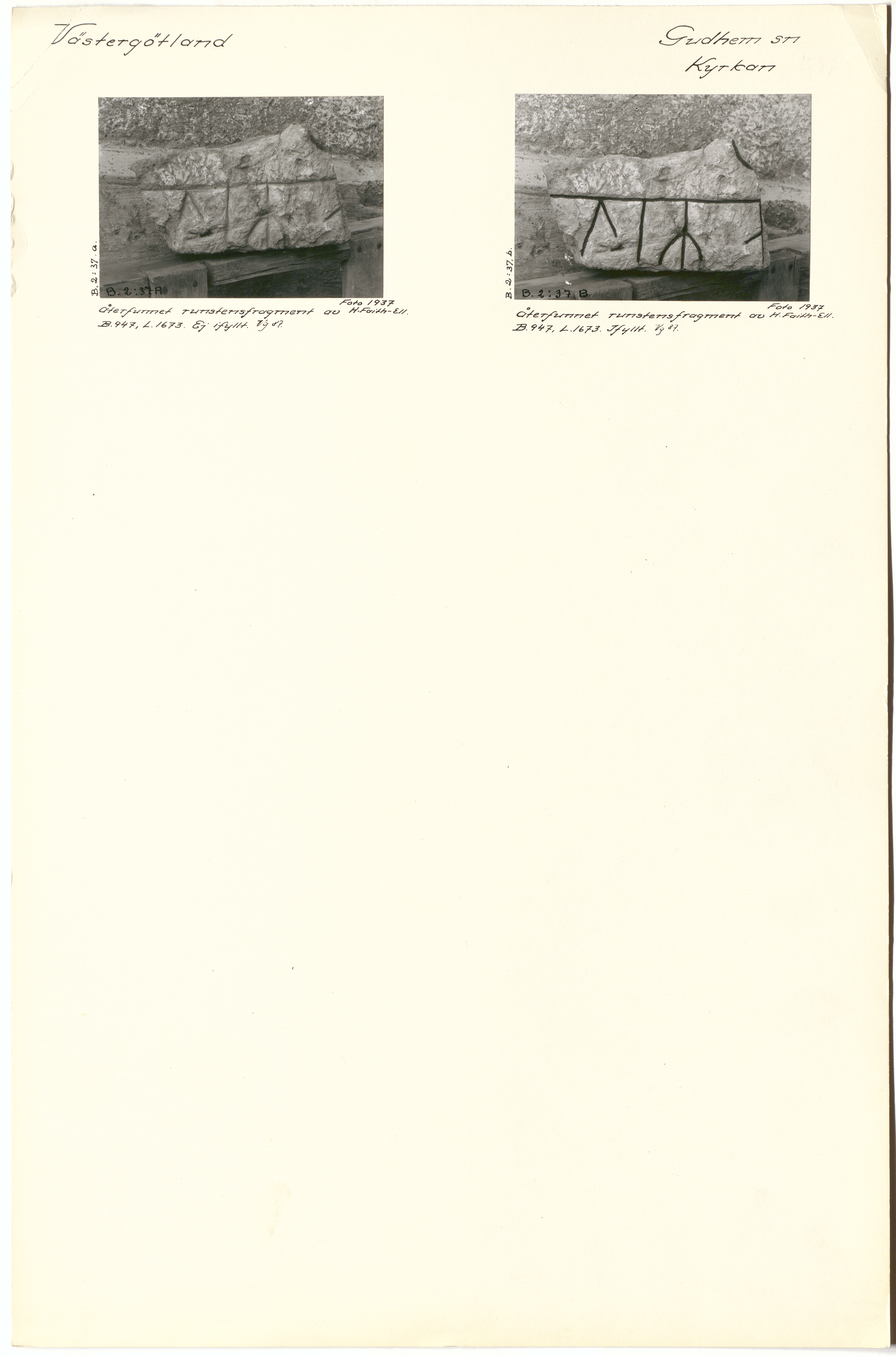 Bild 1: Vg 87. Upphov: Harald Faith-Ell (1937). Bildtext: Återfunnet runstensfragment av B.947, L.1673. Ej ifyllt. || Bild 2: Vg 87. Upphov: Harald Faith-Ell (1937). Bildtext: Återfunnet runstensfragm...
