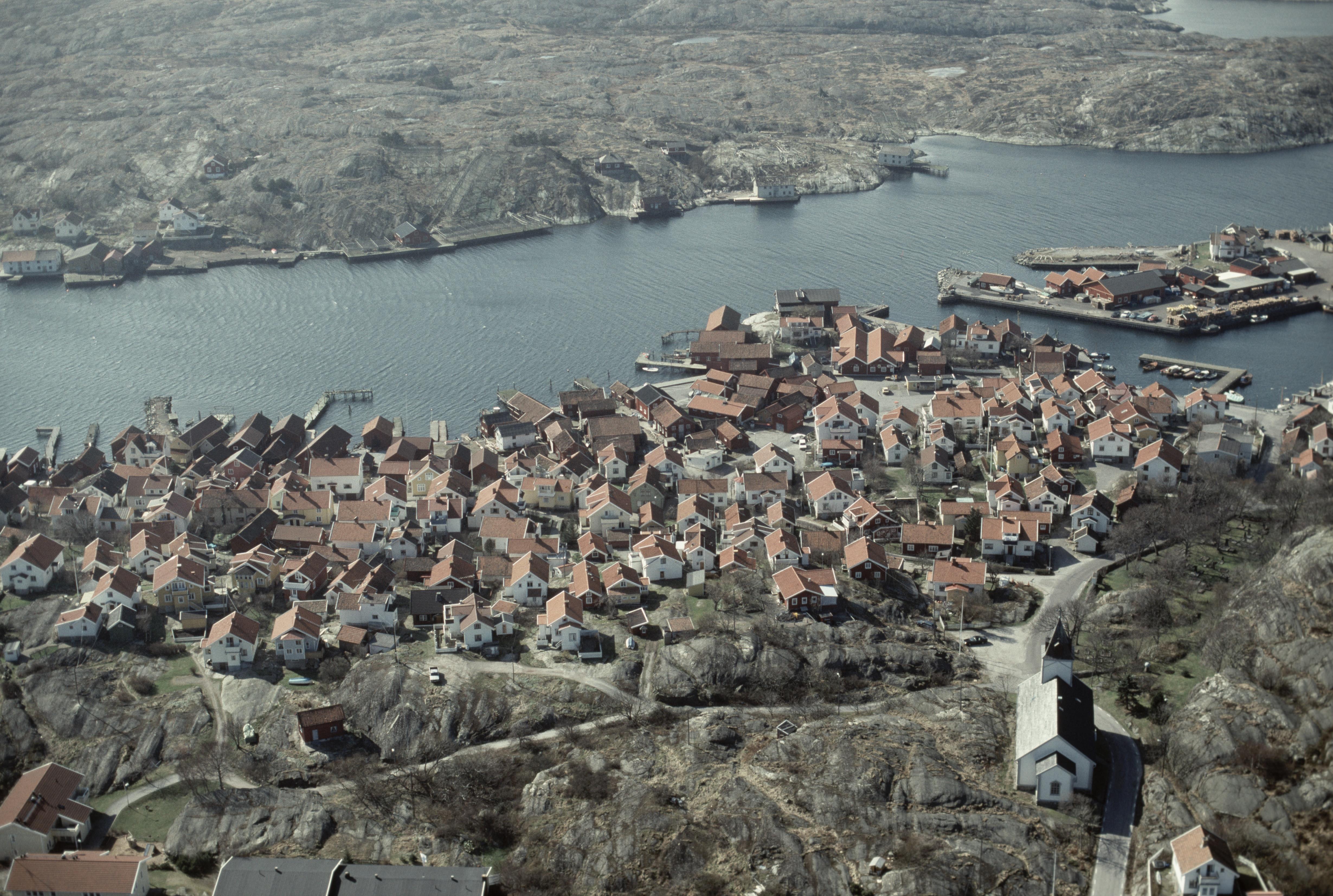 Mollösunds fiskeläge. Hamnanläggning RAÄnr Mollösund 53 vid bildens mitt. Mollösunds kyrka nere till höger. Bilden är tagen mot (väderstreck): VSV Fotosyfte: Flygbildsdokumentation