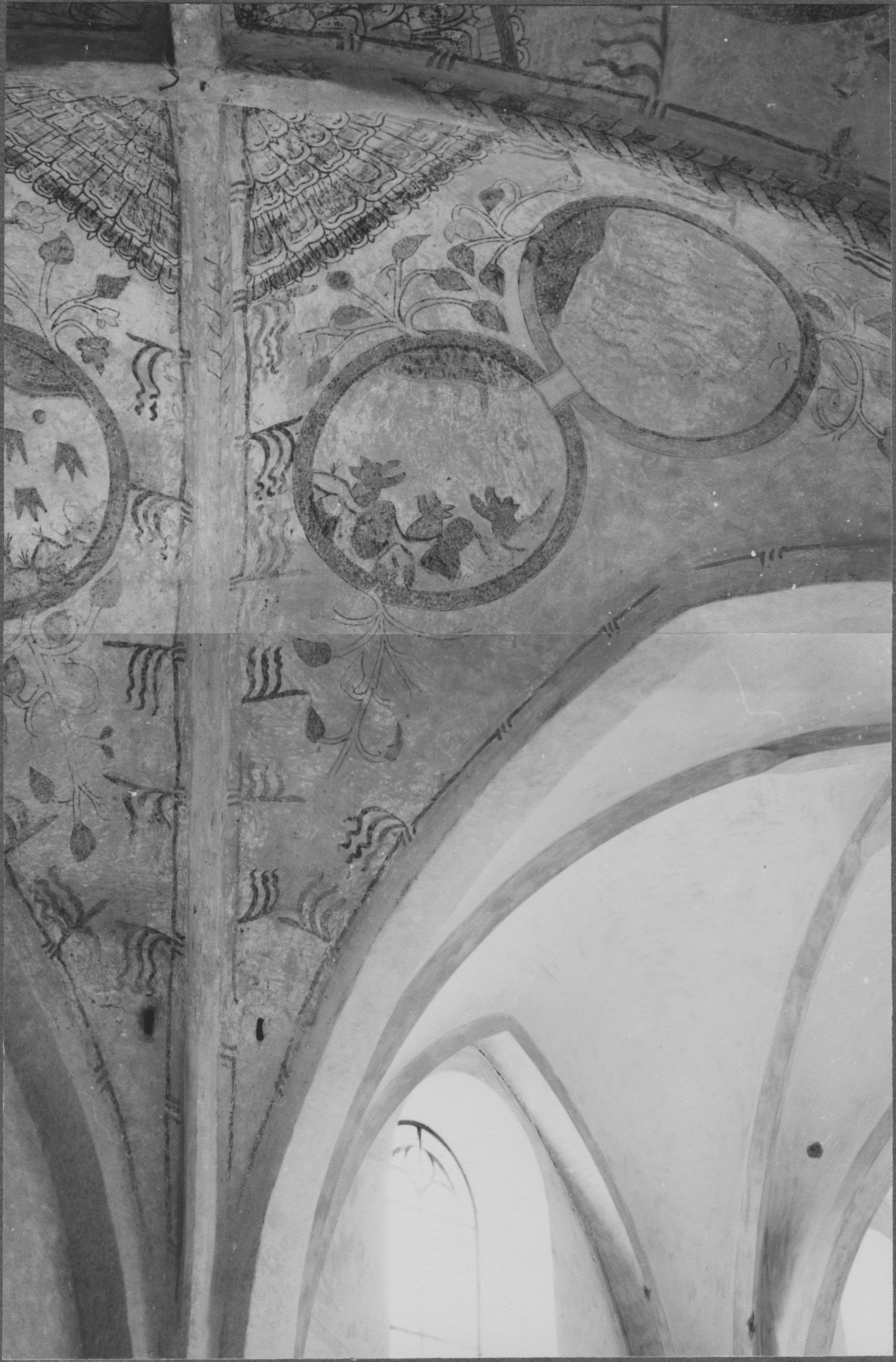 • Kalkmålning i första långhusvalvets sydvästra hörn. Efter restaureringen 1955.