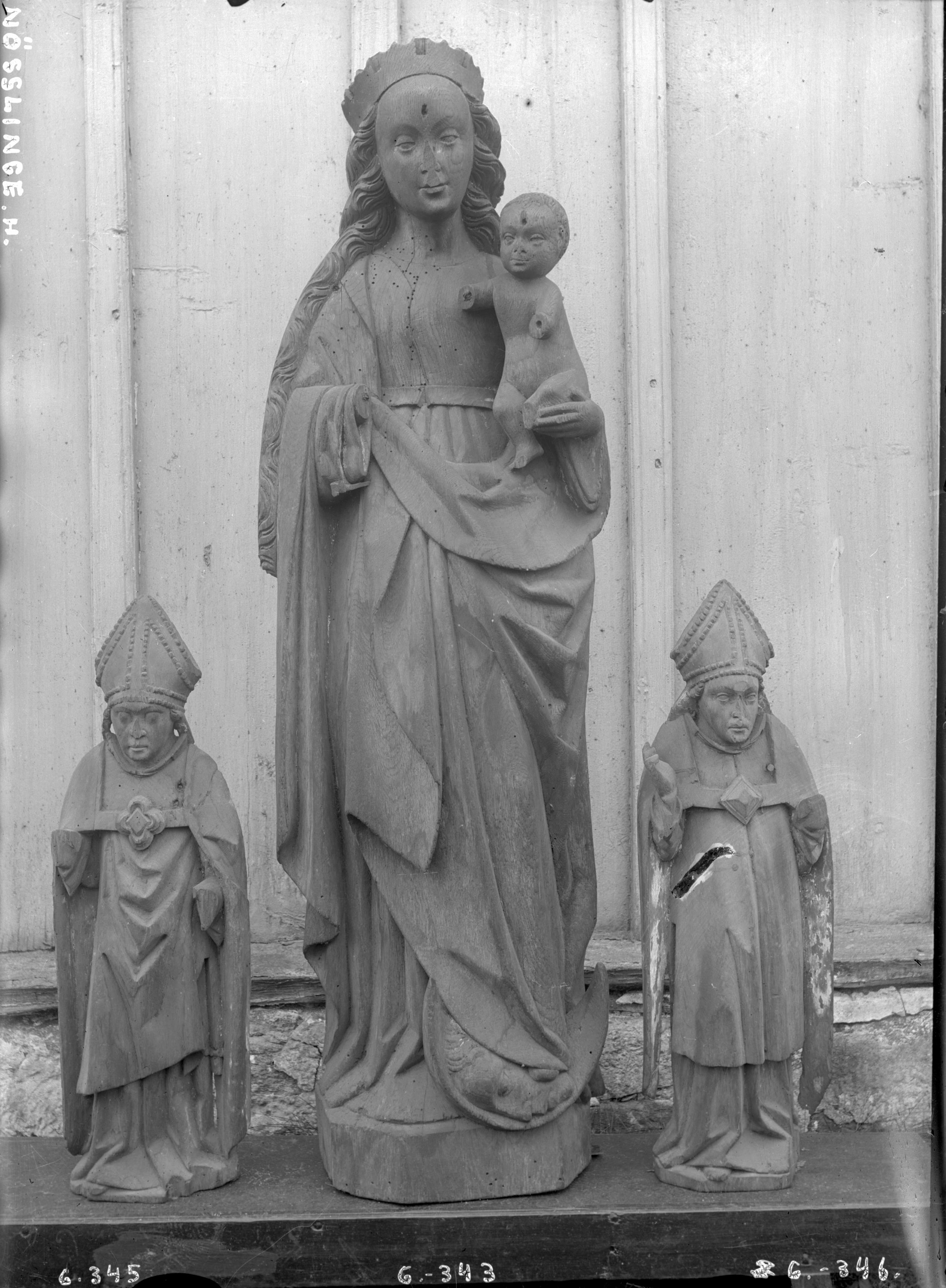 • Träskulpturer. Två biskopar och madonna, omkring 1500.