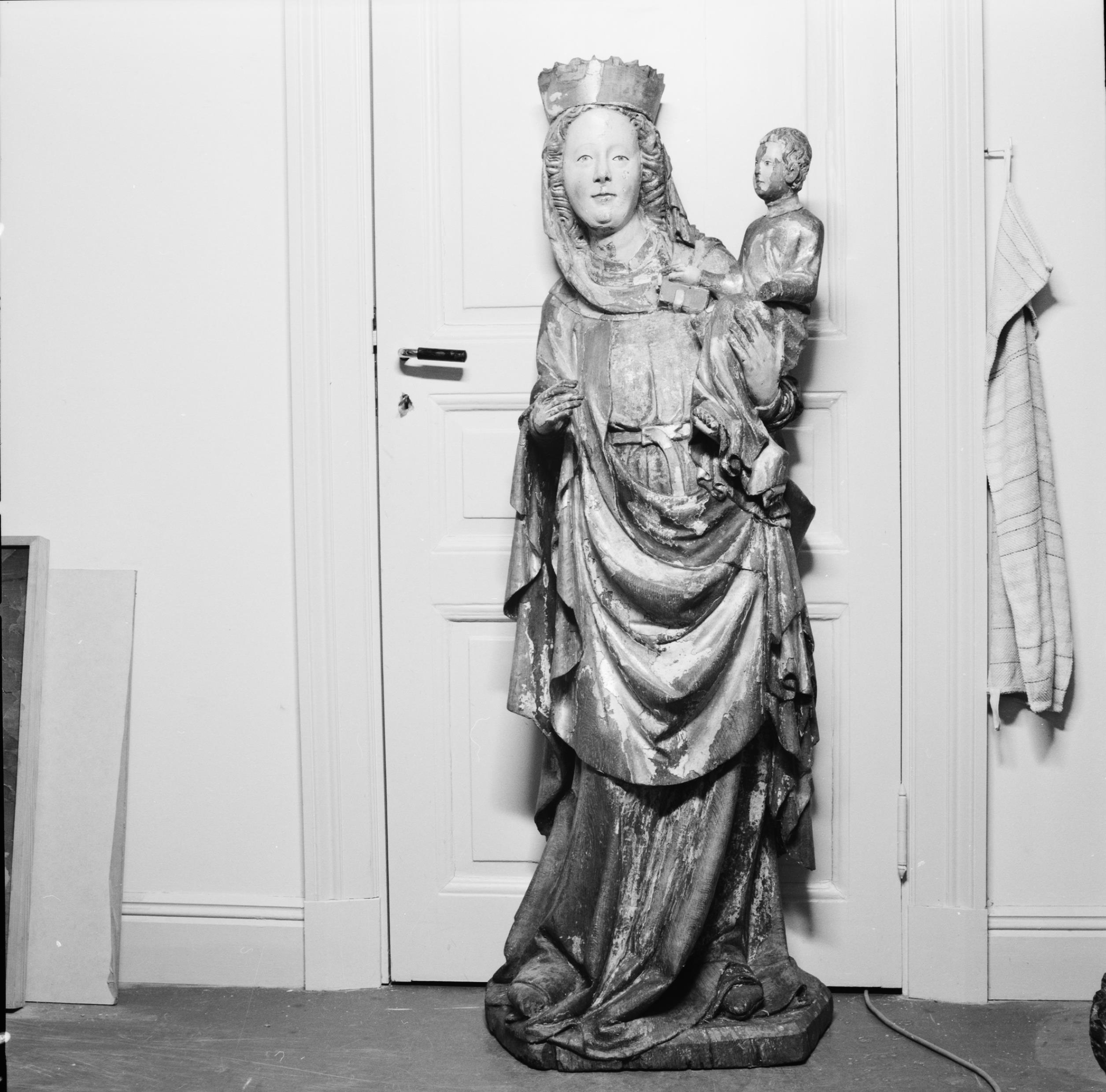 • Träskulptur, Maria med Jesusbarnet. Under arbetet.