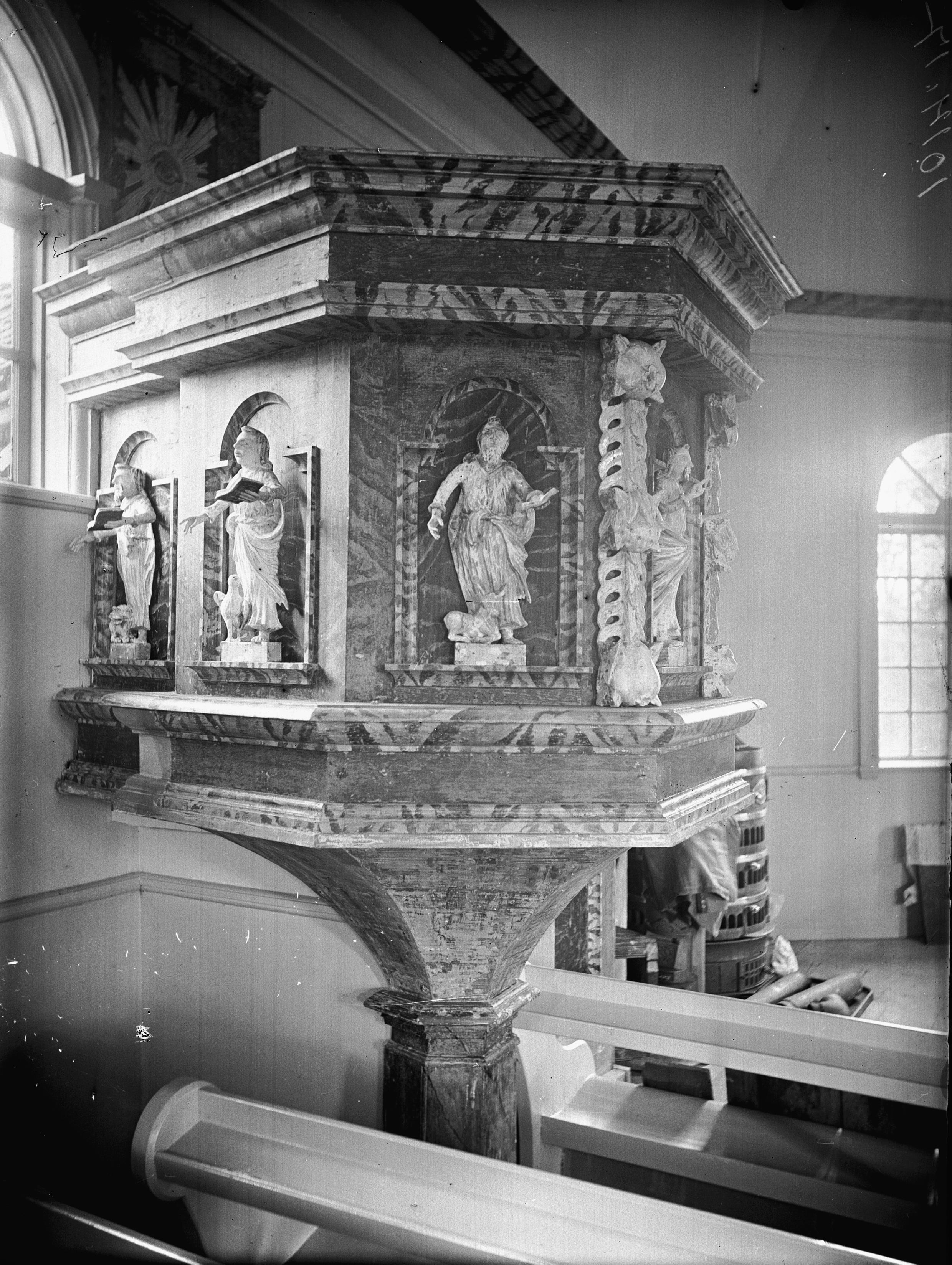 • Predikstol 1700-talet. Efter gamla färgens framtagning. Före restaurering.