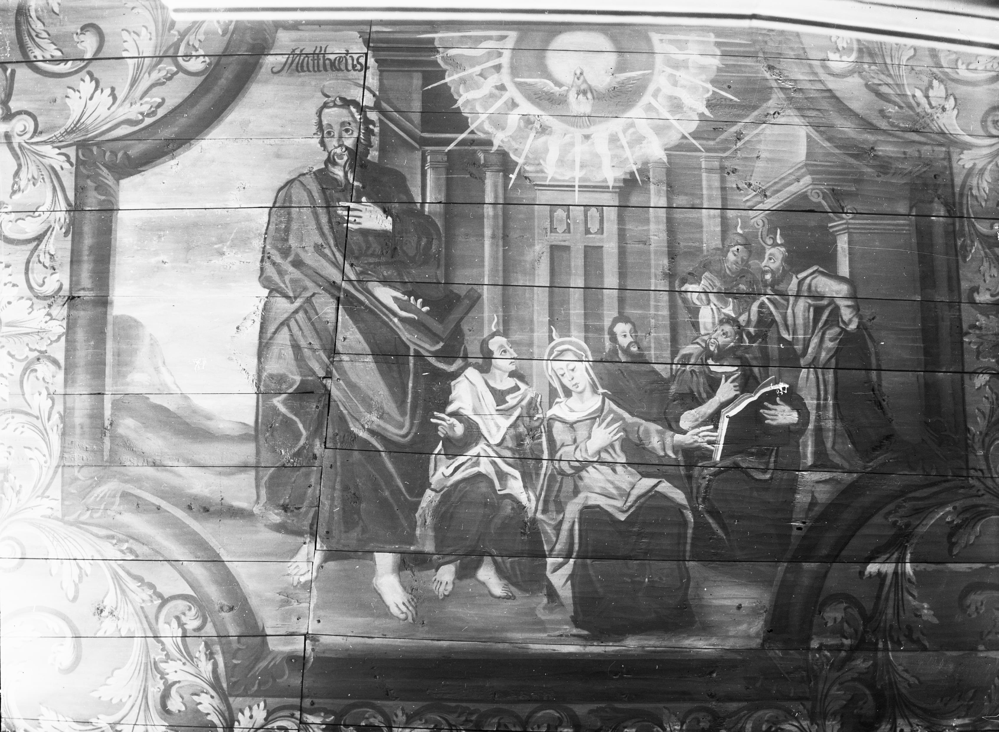 • Takmålning, norra sidoskeppet, Trosbekännelsen, Jag tror på den helige ande, aposteln Matteus.