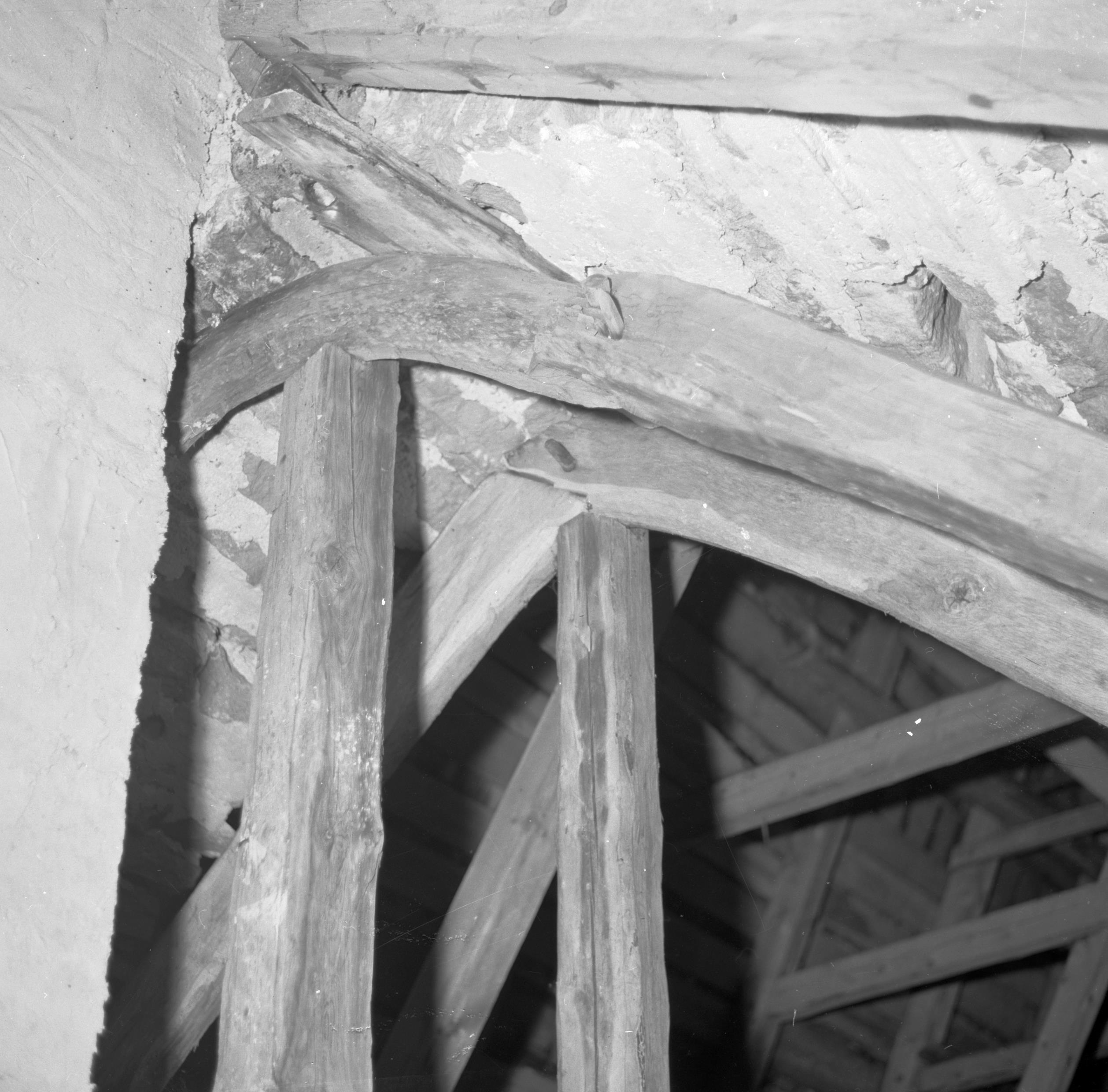 • Medeltida takform i avlastningsbågen mellan långhusets och korets vind.