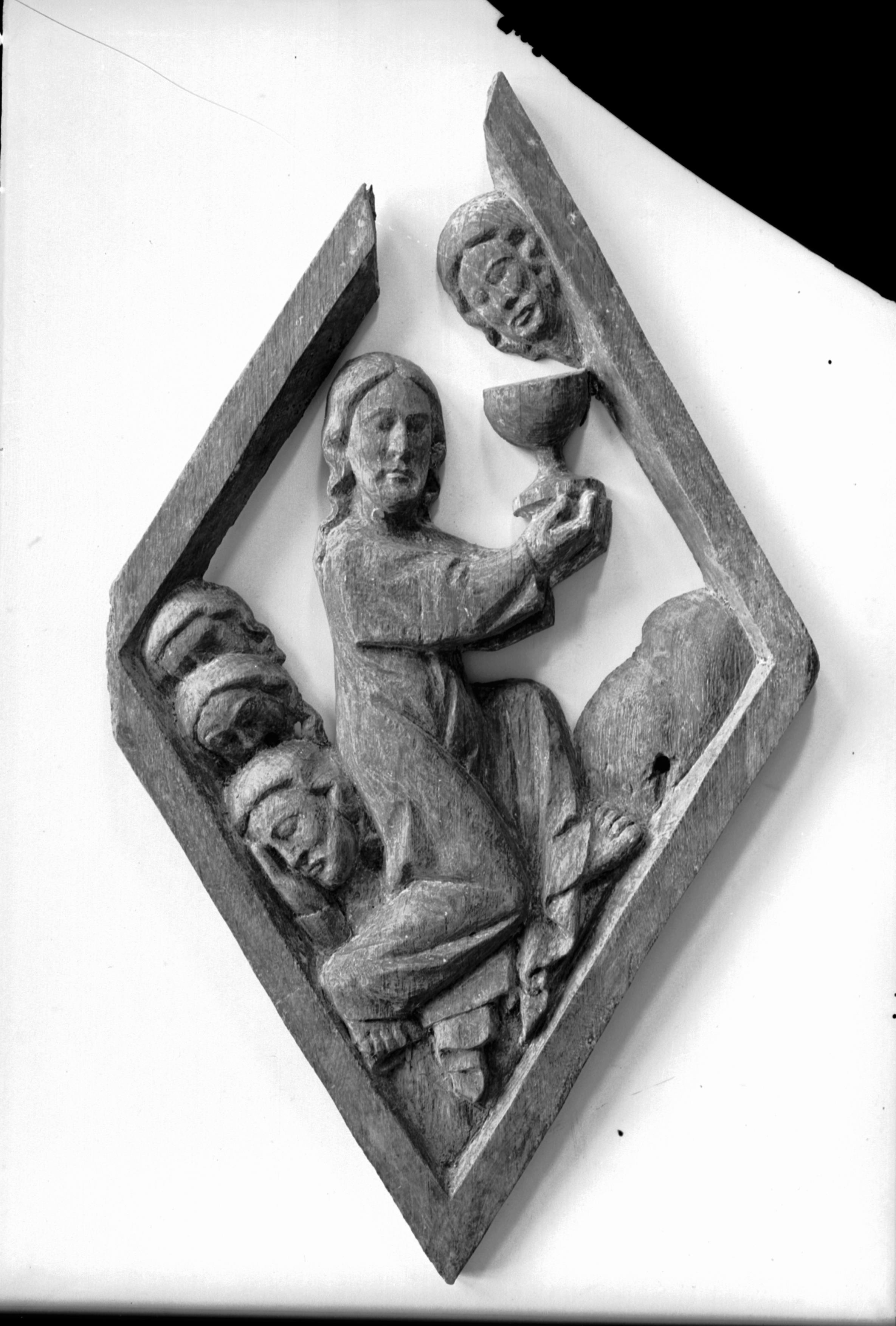 • Triumfkrucifix av trä, detalj. Från 1200-talets senare del. Under konserveringen utförd år 1938 av konservator Alfred Nilsson. Efter övermålningens avlägsnande.