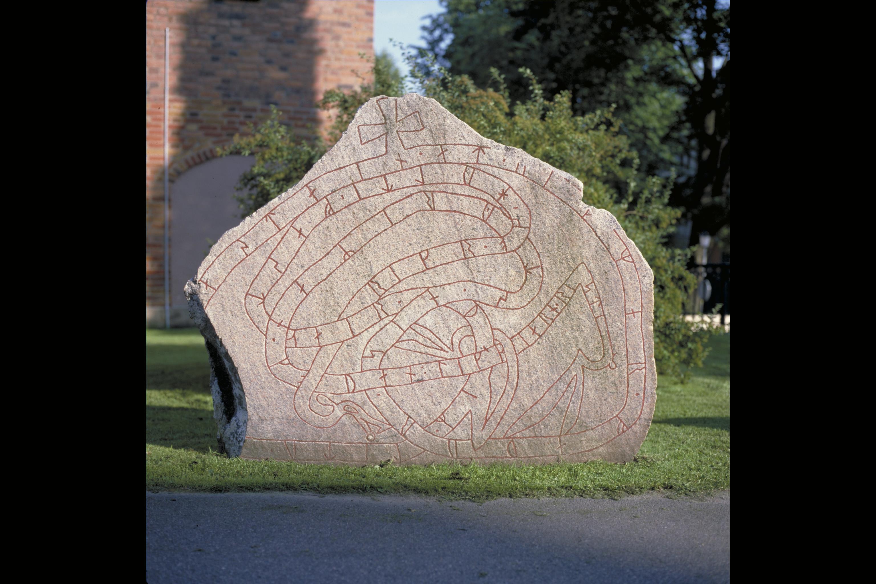 Inskrfiften lyder: Ring (?) och Hulte (och) Fastger de lät .. stenen efter Vigmar, sin fader, en god skeppshövding. Likbjörn ristade. Fotosyfte: Publicering