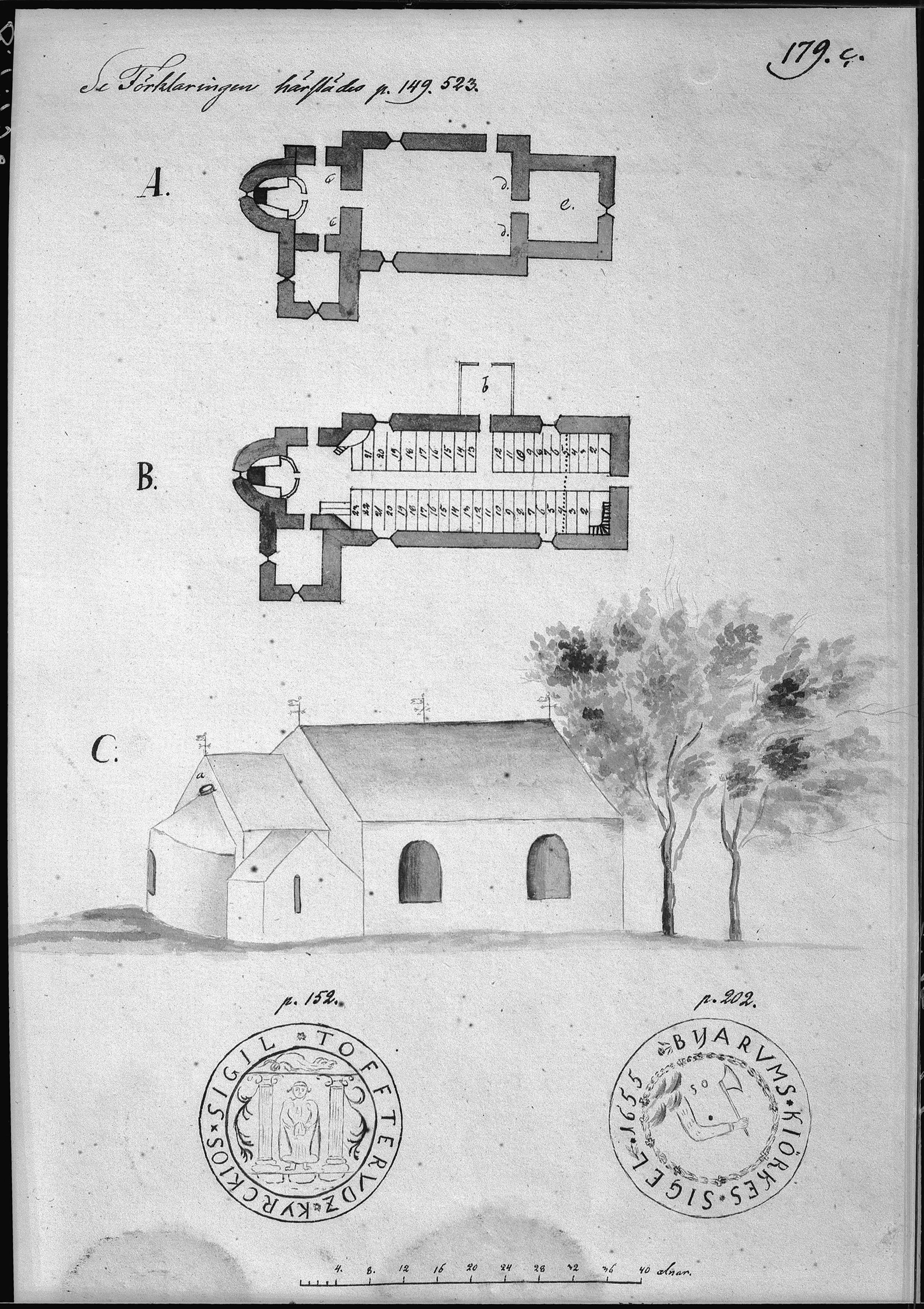 • Kyrkans äldsta kända utseende mot sydväst och planritning. Ur Edvard Lagergren: Strödda anteckningar synnerligen rörande Småland, 1833. Riksarkivets handskriftssamling.