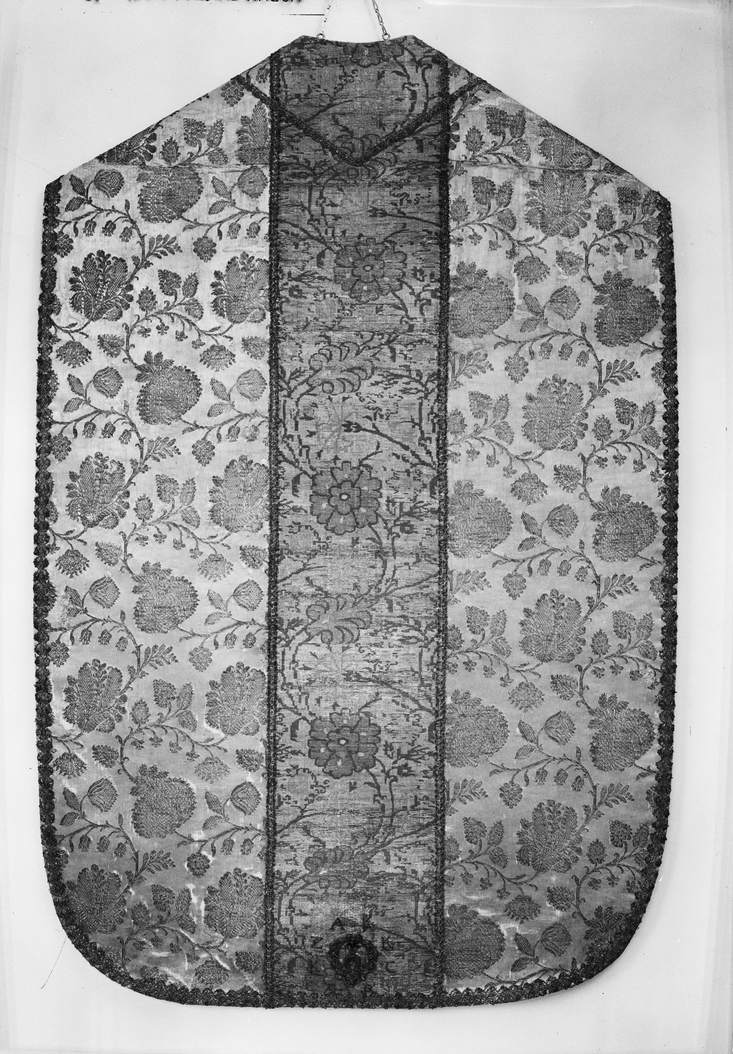 • Mässhake, sidenbrokad, 1700-talet, ryggsida. Efter konservering.