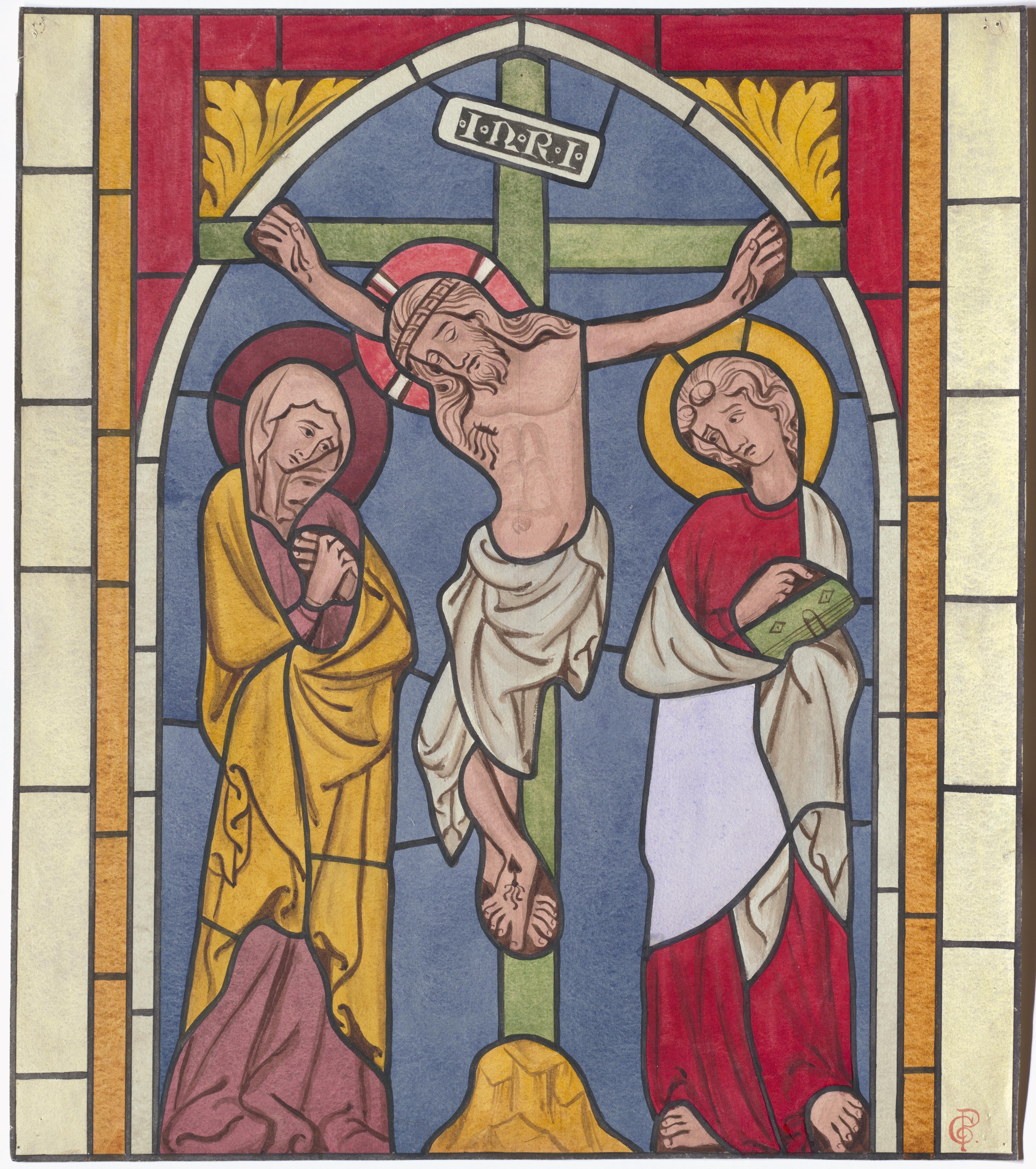 • Korsfästelsen. Medeltida glasmålning i korets östfönster. Akvarell av Gustaf Pettersson från 1800-talets slut.